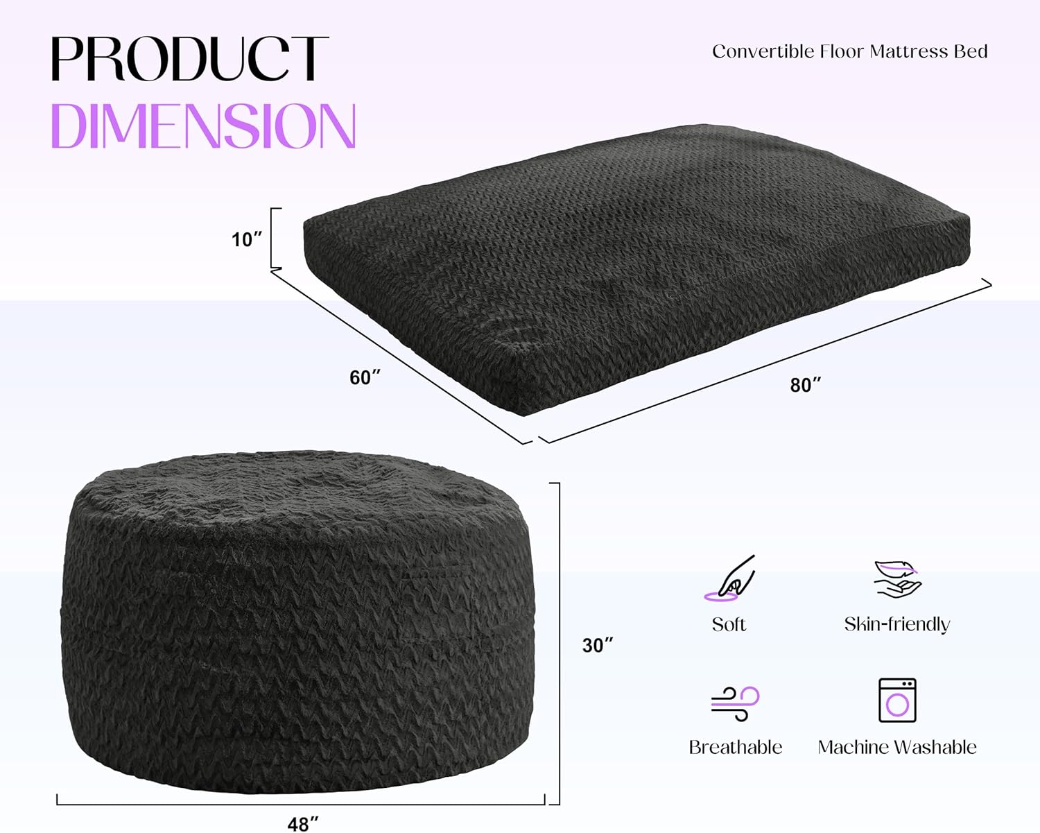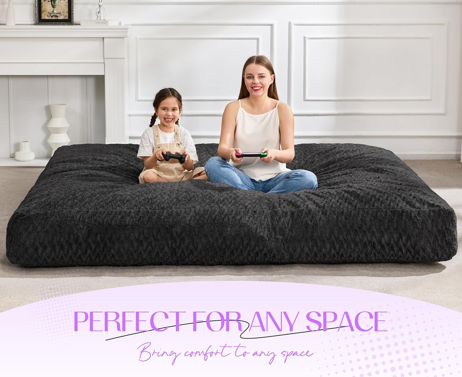 Hobestluk Bean Bag Chair Convertible Beanbag Chairs for Adults, 3 in 1 Bean Bags with Plush Chevron Cover, Adult Bean Bag Chair for Living Room, Bedroom (Black, Queen)