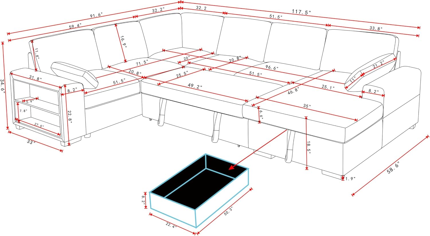 - Easy Assemble Pull Out Sectional Sofa Bed :Overall sofa size:117.72"*91.73"*34.65"H.We have provided all the necessary installation tools. It is recommended that two people install this sectional sofa bed together. This sofa comes in 4 packages, these packages may not arrive on the same day. Please wait until all the packages have arrived before starting the installation.