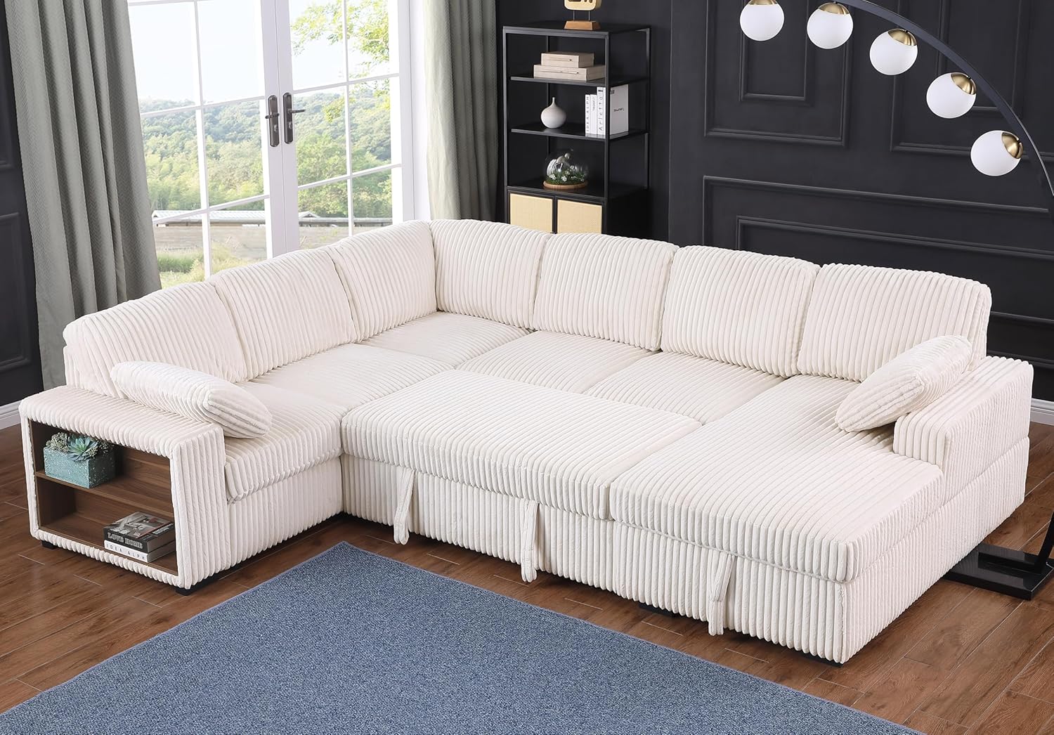 Eafurn Oversized Convertible U Shaped Sleeper Sectional Sofa Pull Out Couch Bed, 6 Seater Corduroy Upholstered Pullout Lounge Sofa Couch Sofabed w/Storage Chaise, Shelves for Living Room Apartment