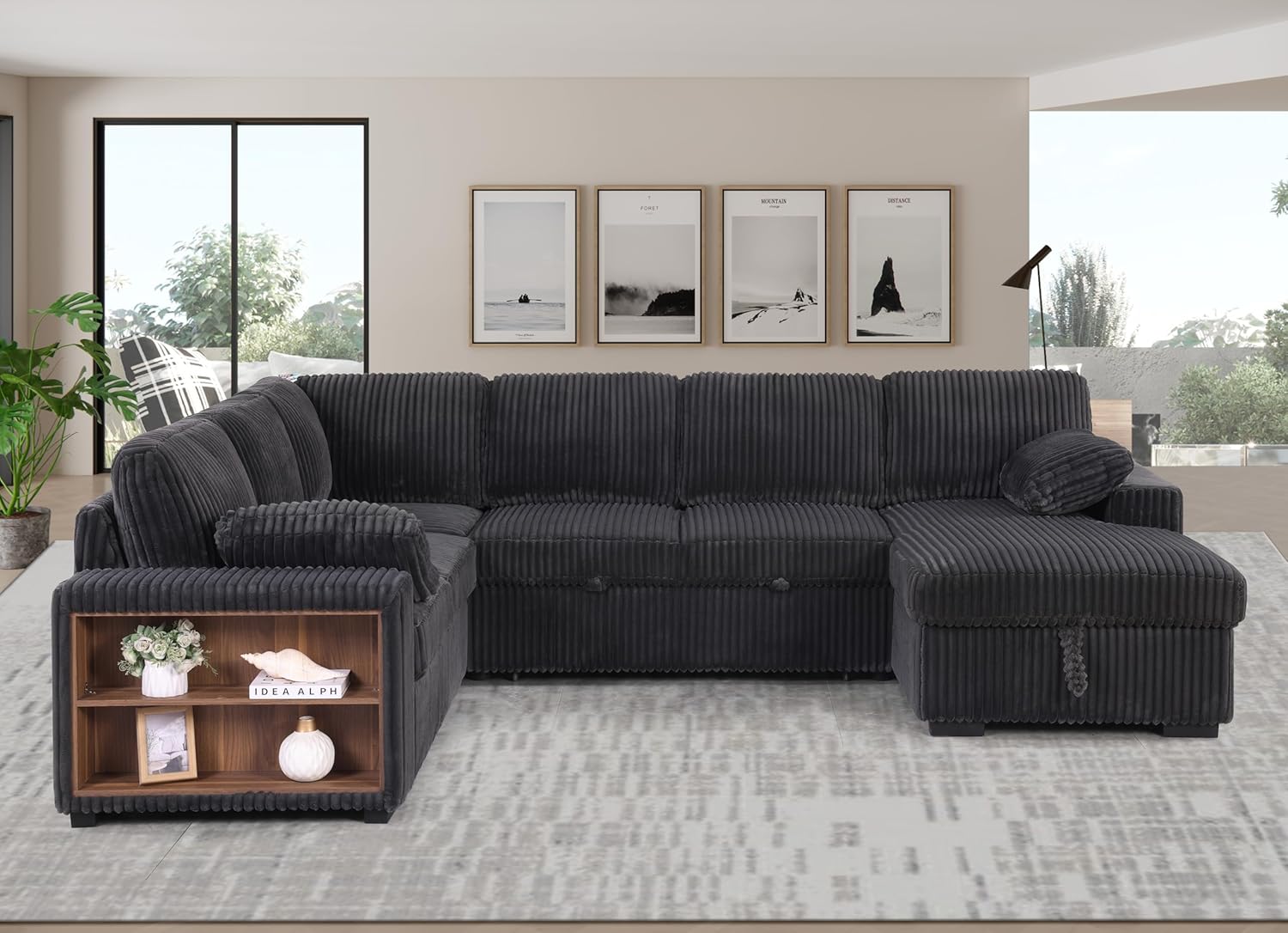 Eafurn Oversized U Shaped Convertible Sleeper Sectional Sofa w/Pull Out Couch Bed, 6 Seater Corduroy Upholstered Corner Lounge Sofa Couch Sleeper Sofabed w/Storage Chaise,Shelves