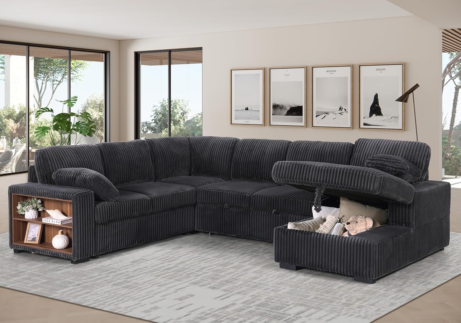 - Plush Oversized Sectional Sofa Bed - Made from breathable, skin-friendly plush corduroy fabric, this sectional sleeper sofa with pull out bed provides a soft and natural touch. The seat cushions, thickened to 6.69 inches and filled with high-density foam, offer excellent support, ensuring you won't "sink in" or feel the hard frame when sitting or lying down. The included two soft throw pillows give added back support for extra comfort.