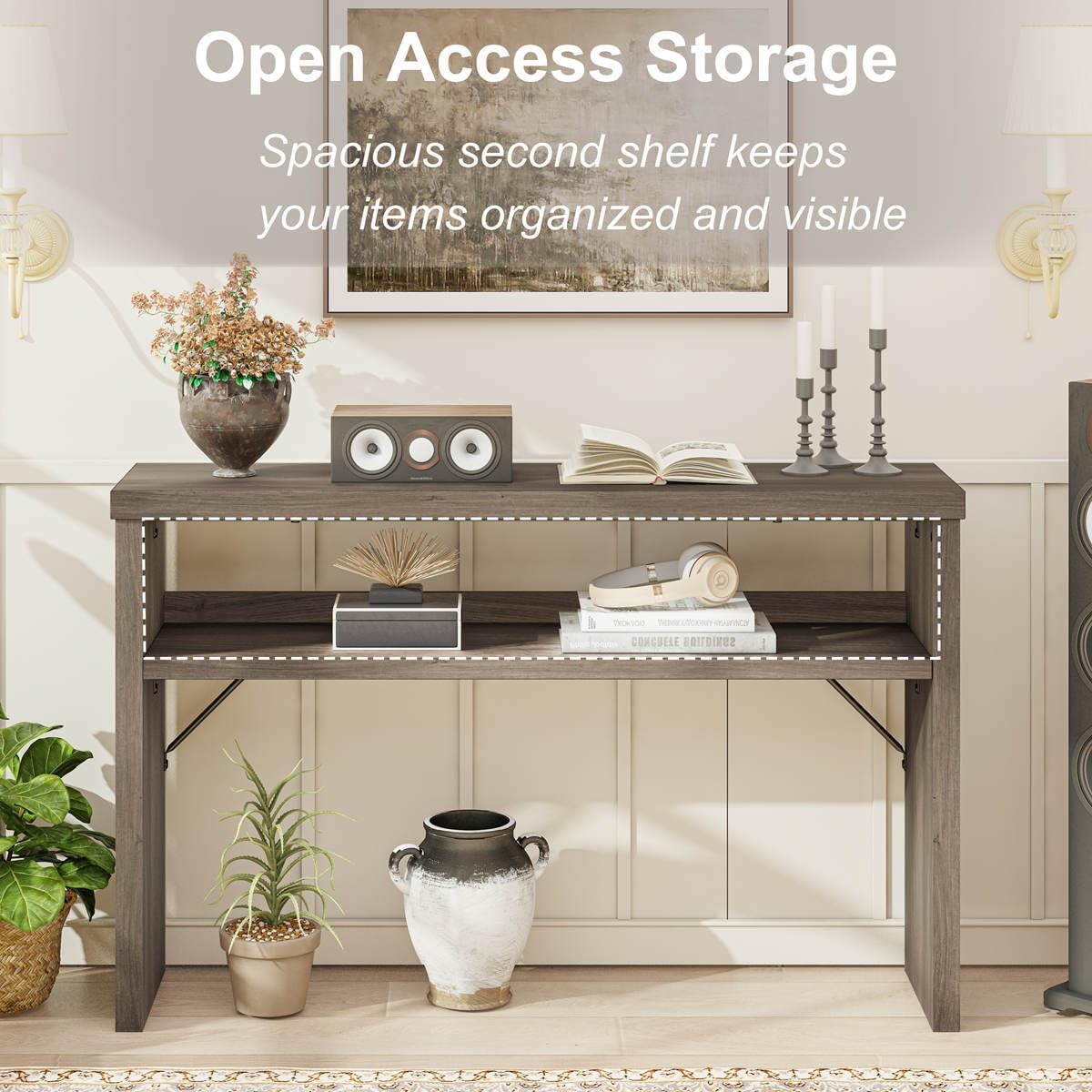 - Two-Tier Entryway Table: This sofa table features a spacious 47" tabletop and an open lower shelf for books, baskets, and decorative pieces. The 2 tier layout offers ample storage while keeping everything visible and easy to access, perfect for use as a console table, hallway table, or behind couch table.