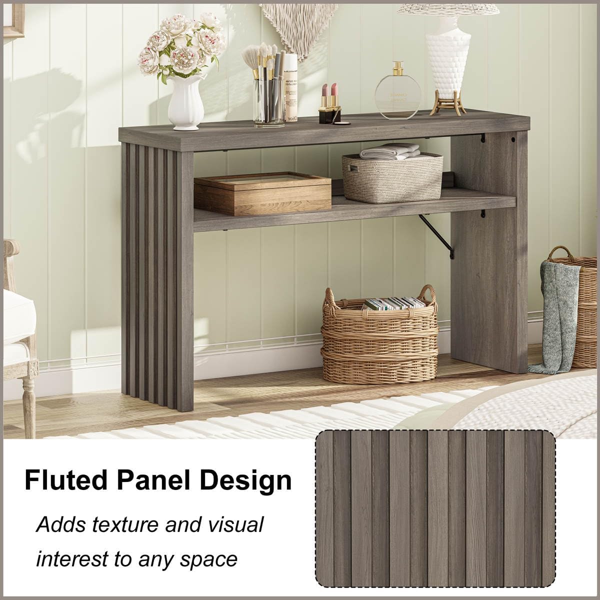 - Fluted Console Style: Designed with elegant slatted side panels, this console table behind couch blends modern charm with versatile appeal. Available in rustic oak, black oak, and greige oak wood grain finishes, it complements farmhouse, industrial, and contemporary home décor.
