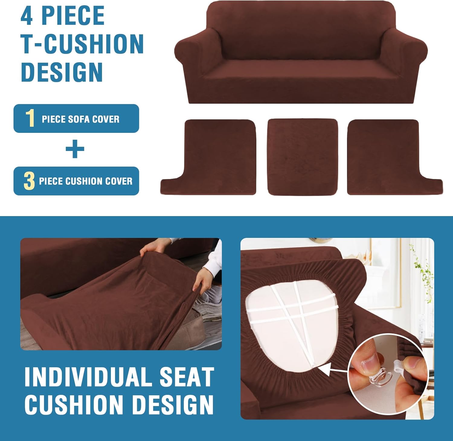 H.VERSAILTEX Sofa Cover 4 Piece T Cushion Sofa Slipcovers Thick Velvet Couch Cover Stretch T Cushion Sofa Covers for 3 Cushion Couch with 3 Individual T Cushion Covers, Burnt Brick