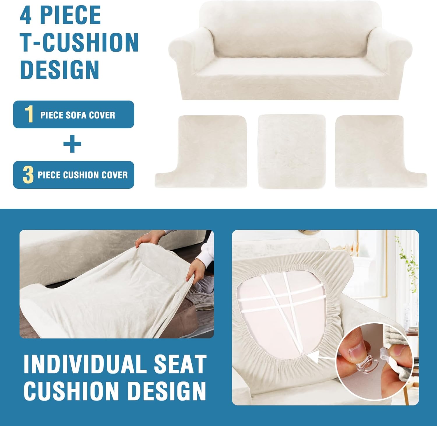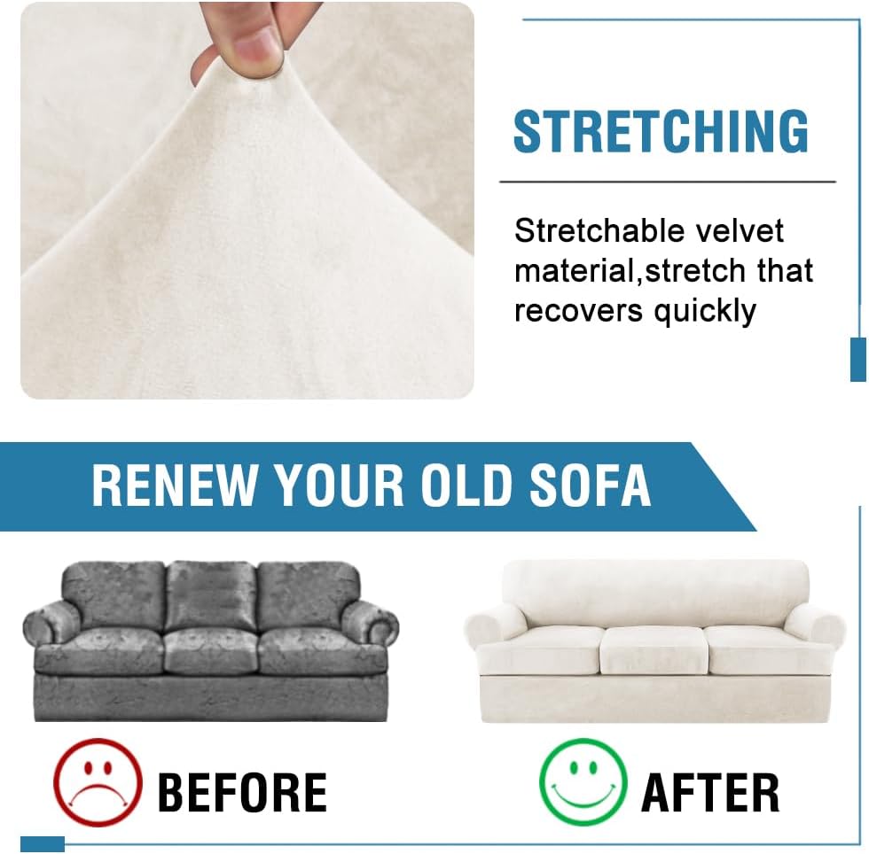 H.VERSAILTEX Sofa Cover 4 Piece T Cushion Sofa Slipcovers Thick Velvet Couch Cover Stretch T Cushion Sofa Covers for 3 Cushion Couch with 3 Individual T Cushion Covers, Porcelain
