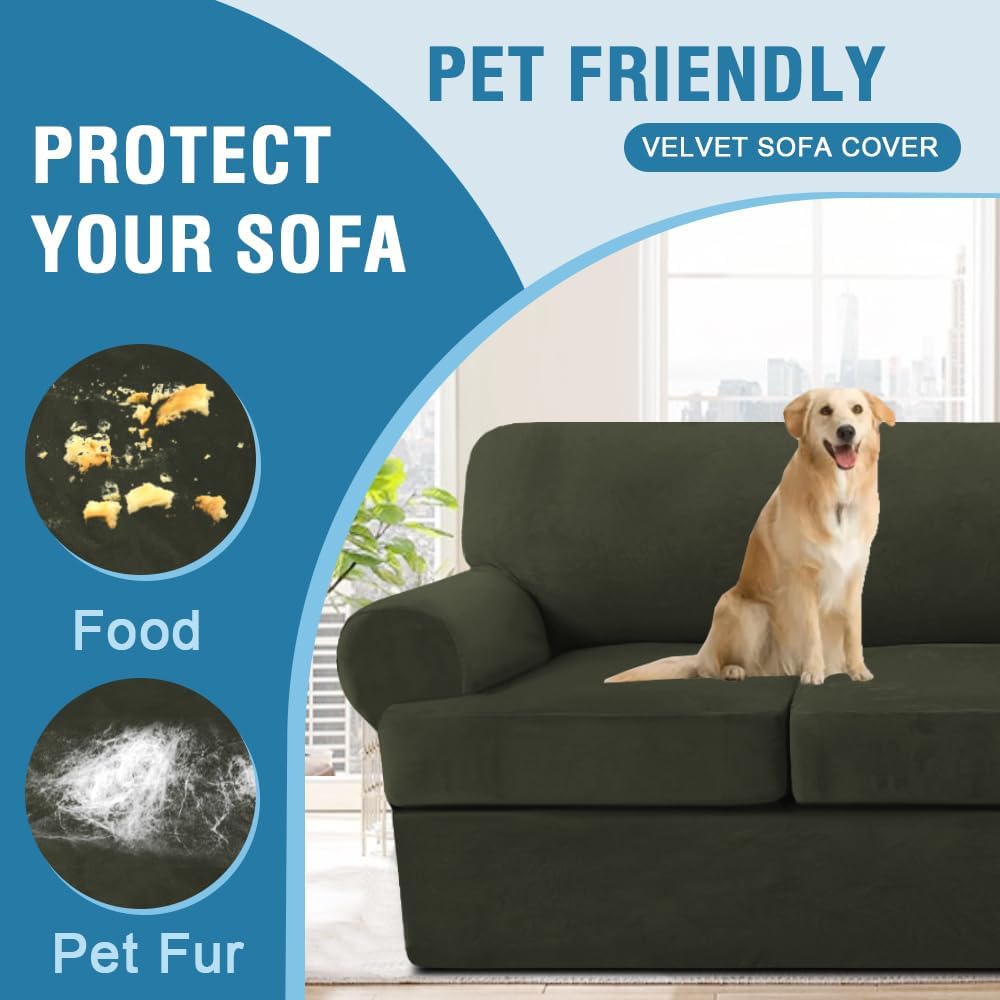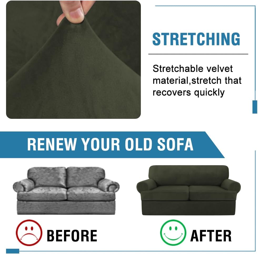 H.VERSAILTEX Sofa Cover 3 Piece T Cushion Loveseat Slipcovers Thick Velvet Couch Cover Stretch T Cushion Sofa Covers for 2 Cushion Couch with 2 Individual T Cushion Covers, Olive