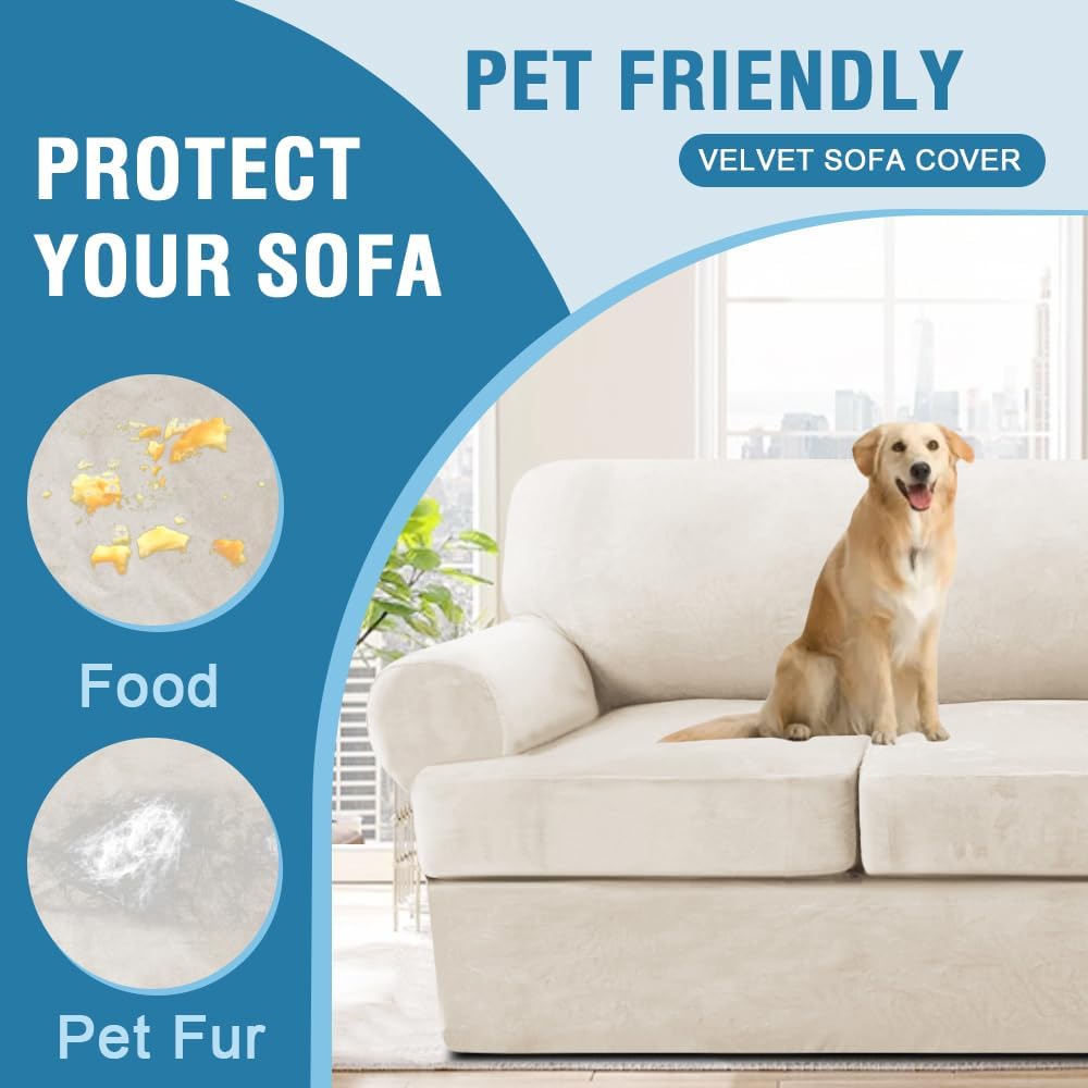 H.VERSAILTEX Sofa Cover 3 Piece T Cushion Sofa Slipcovers Thick Velvet Couch Cover Stretch T Cushion Sofa Covers for 2 Cushion Couch with 2 Individual T Cushion Covers, Porcelain