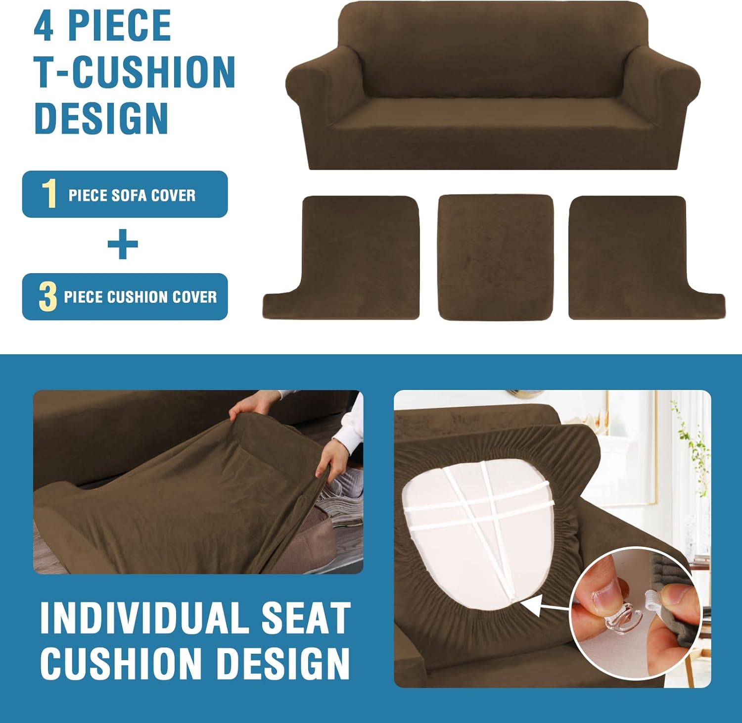 H.VERSAILTEX Sofa Cover 4 Piece T Cushion Sofa Slipcovers Thick Velvet Couch Cover Stretch T Cushion Sofa Covers for 3 Cushion Couch with 3 Individual T Cushion Covers, Bronze Brown