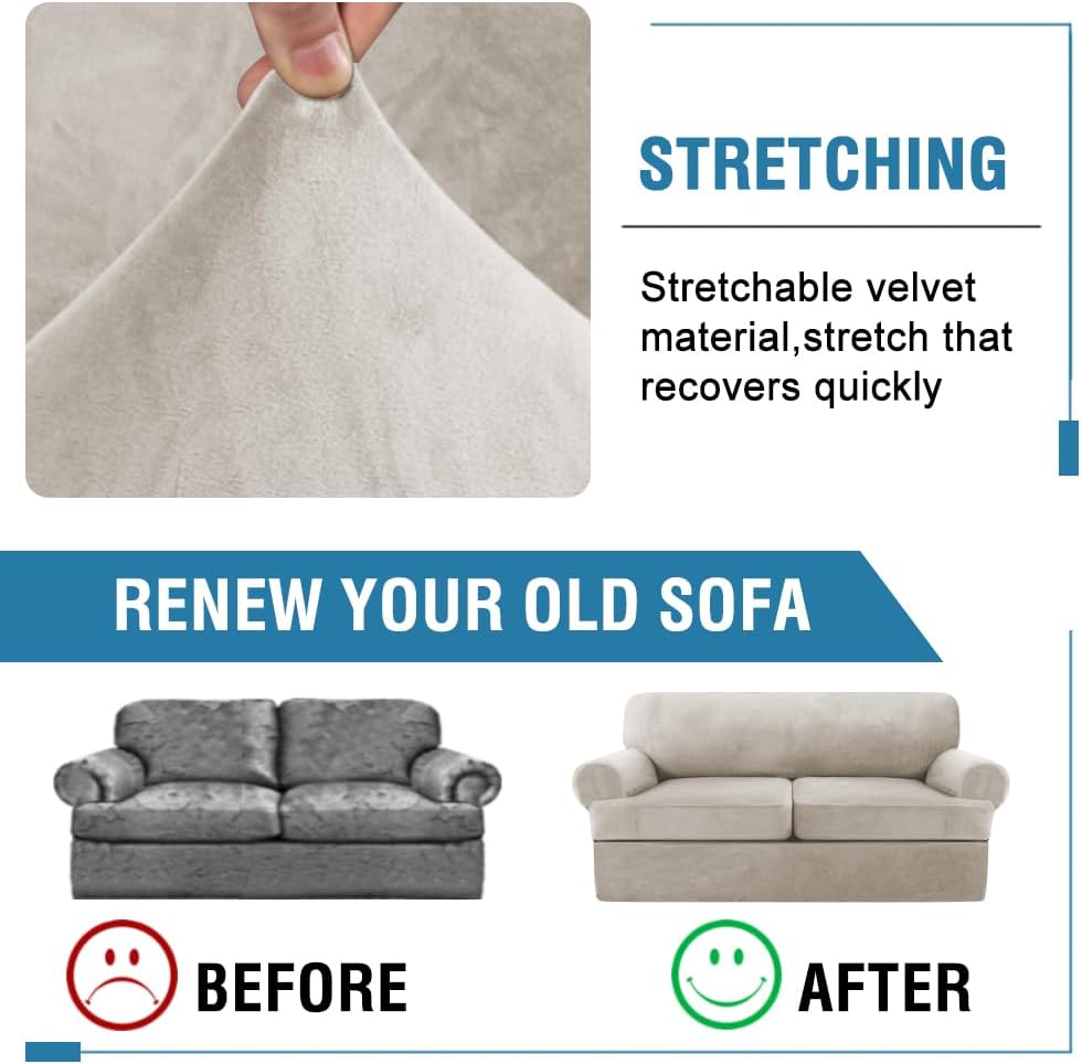 H.VERSAILTEX Sofa Cover 3 Piece T Cushion Loveseat Slipcovers Thick Velvet Couch Cover Stretch T Cushion Sofa Covers for 2 Cushion Couch with 2 Individual T Cushion Covers, French Oak