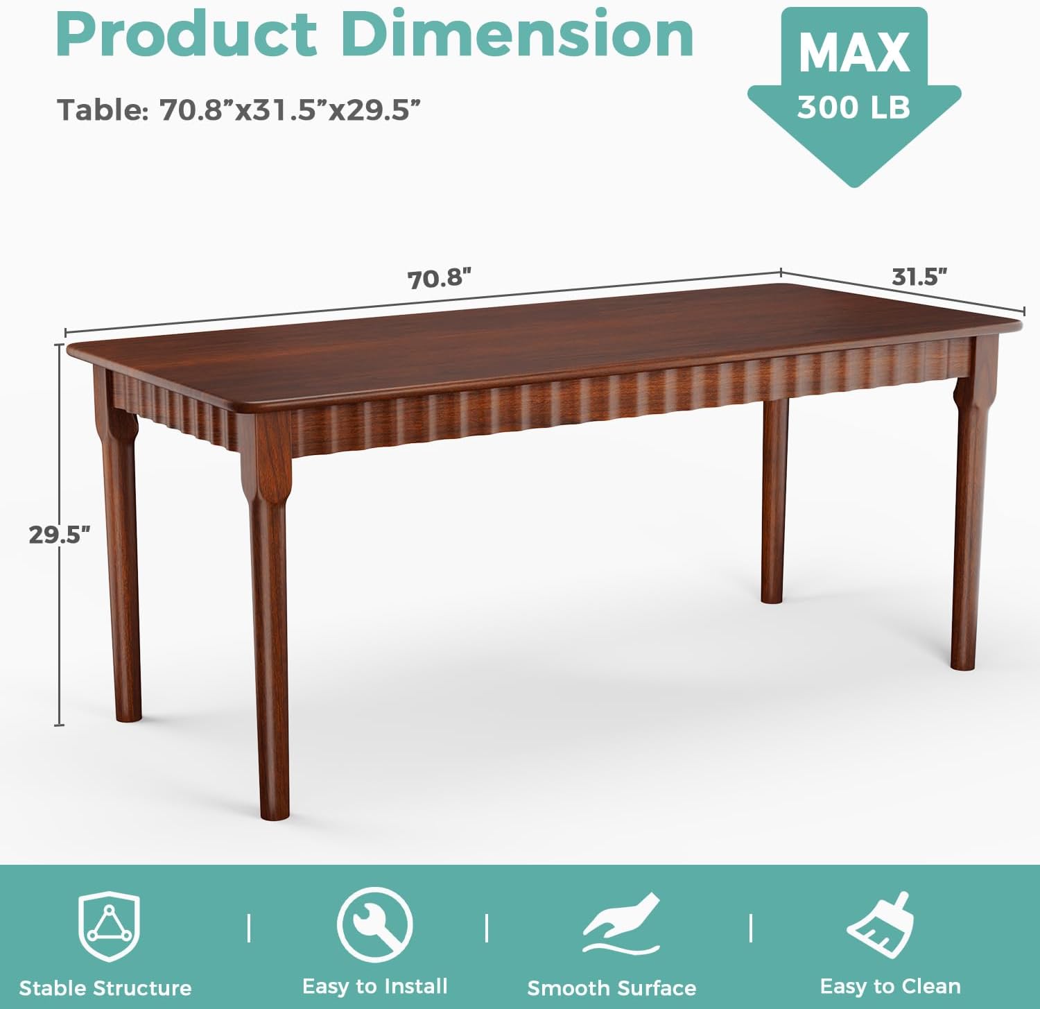 - Enhancing Dining Experience: The tabletop is handcrafted, polished, and easy to clean. The rounded corners eliminate sharp edges, providing a reliable dining experience. This indoor dining table, measuring 70.86"L x 31.5"D x 29.5"H, can comfortably accommodate 6-8 people for dining. When not in use, the 29-inch high rectangular dining table allows chairs to be easily pushed underneath, maximizing space utilization.