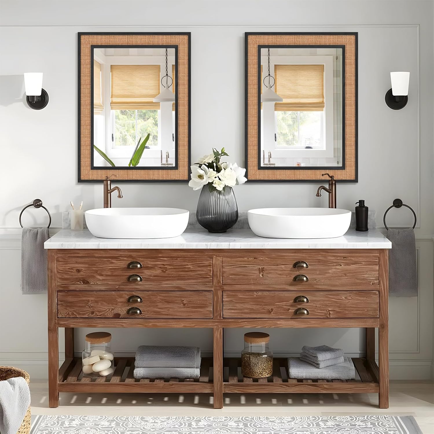 Rattan Wall Mirror with Wooden Framed 24 X 32 inch Farmhouse Rectangle Wood Mirror for Modern Decorative Bathroom, Living Room, Entryway, Bedroom (Black)