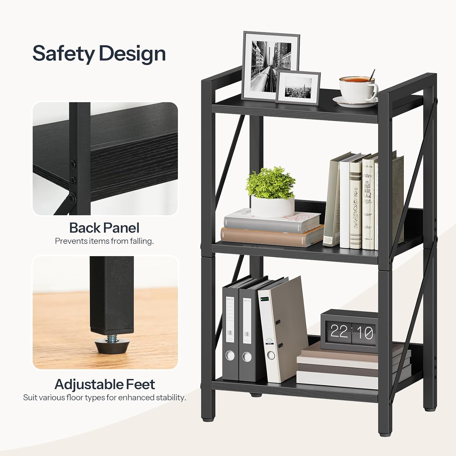 - Sturdy Construction: Made of quality particleboard and a metal frame, each shelf can support up to 40 pounds. The anti-tip device and adjustable feet add extra stability, protecting your books and decorations