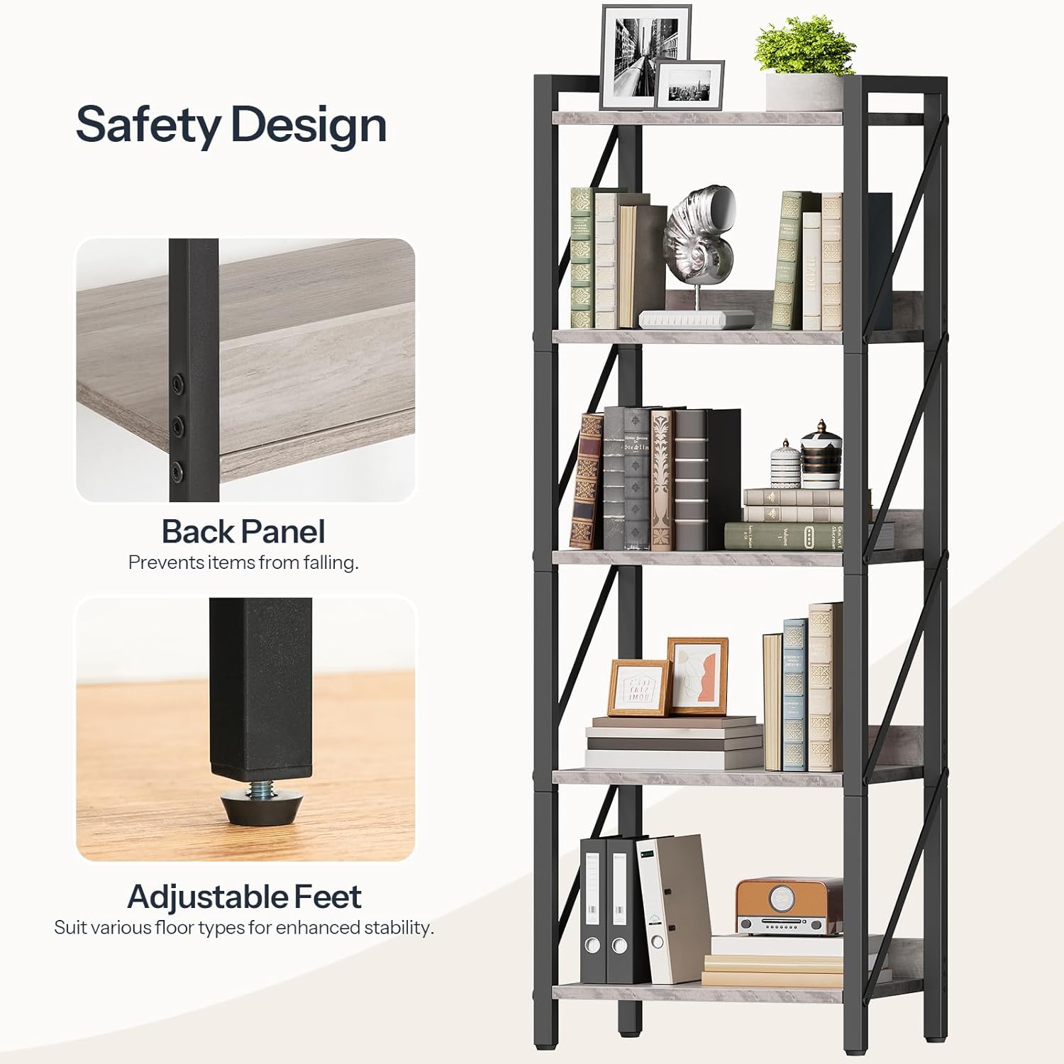 - Sturdy Construction: Made of quality particleboard and a metal frame, each shelf can support up to 40 pounds. The anti-tip device and adjustable feet add extra stability, protecting your books and decorations
