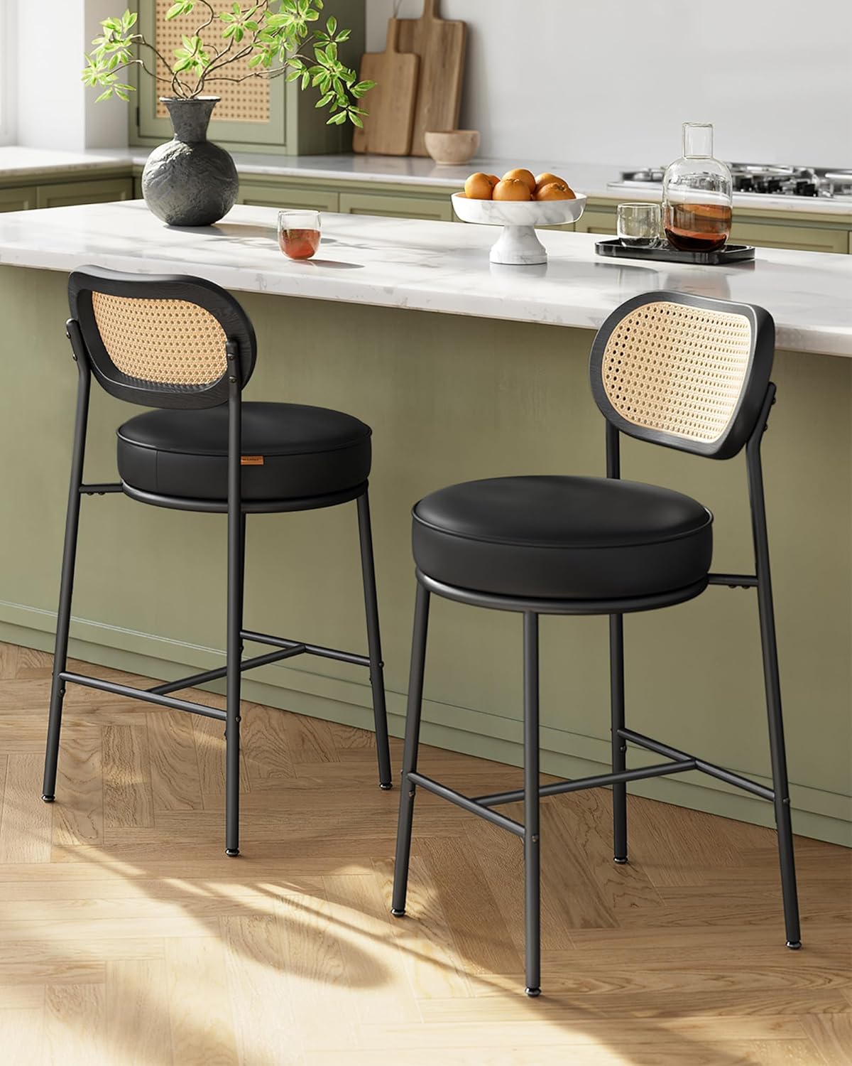 VASAGLE Bar Stools Set of 2, Bar Height Stools with Rattan Back and Metal Legs, 25.1-Inch Tall Counter Chairs, Modern Leather Upholstered Barstools for Kitchen Island Dining Room, Ink Black