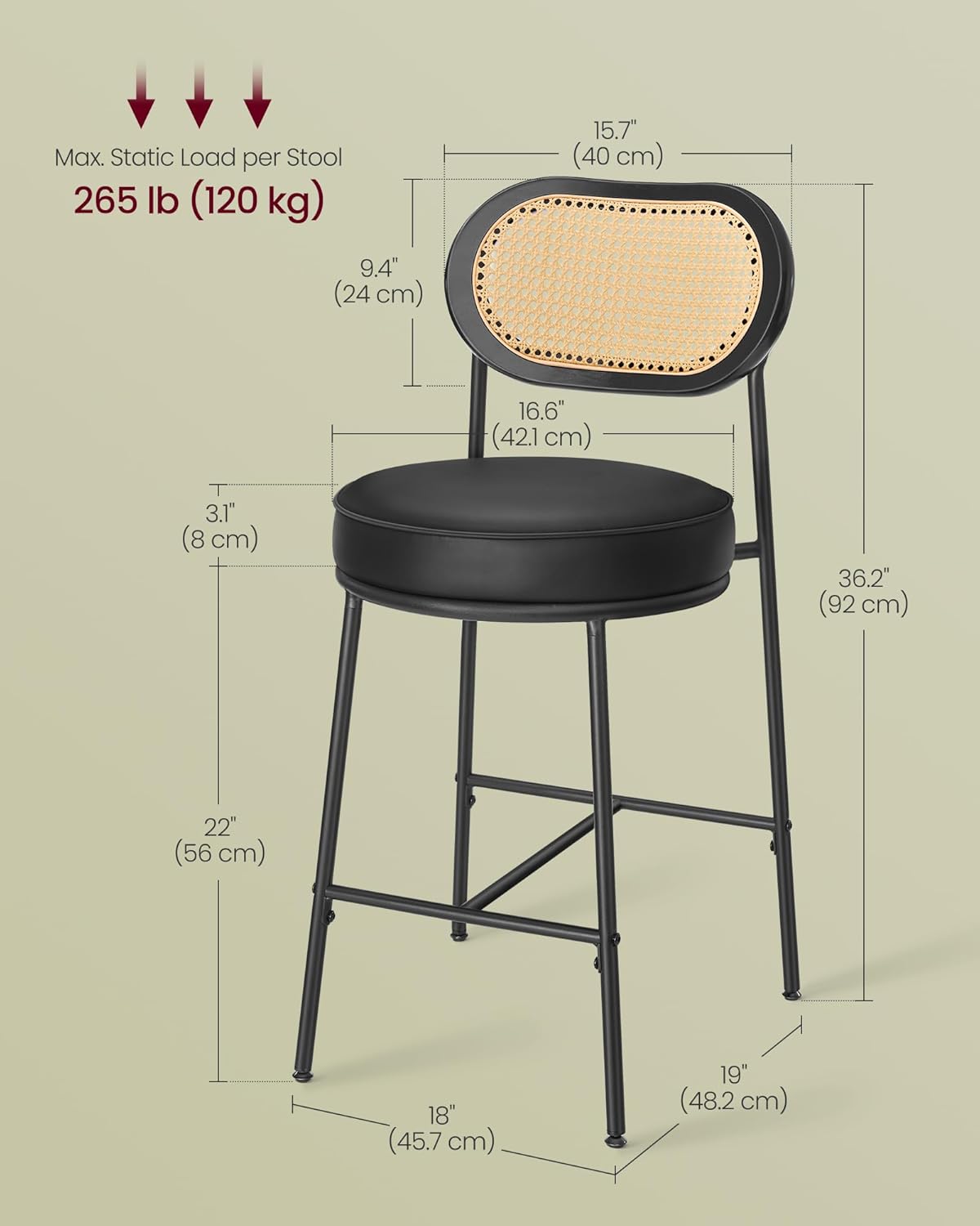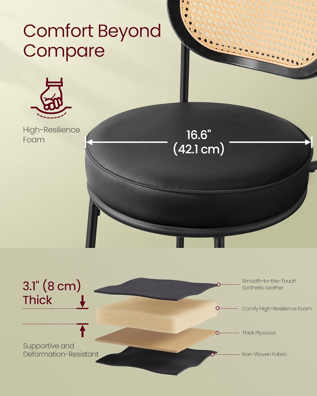 - 【EMBRACE BOHO CHIC】With PE rattan backrests incorporating boho elements, these bar chairs add a warm, natural touch to various home decors. They’re perfect for wabi-sabi, contemporary, or mid-century modern styles