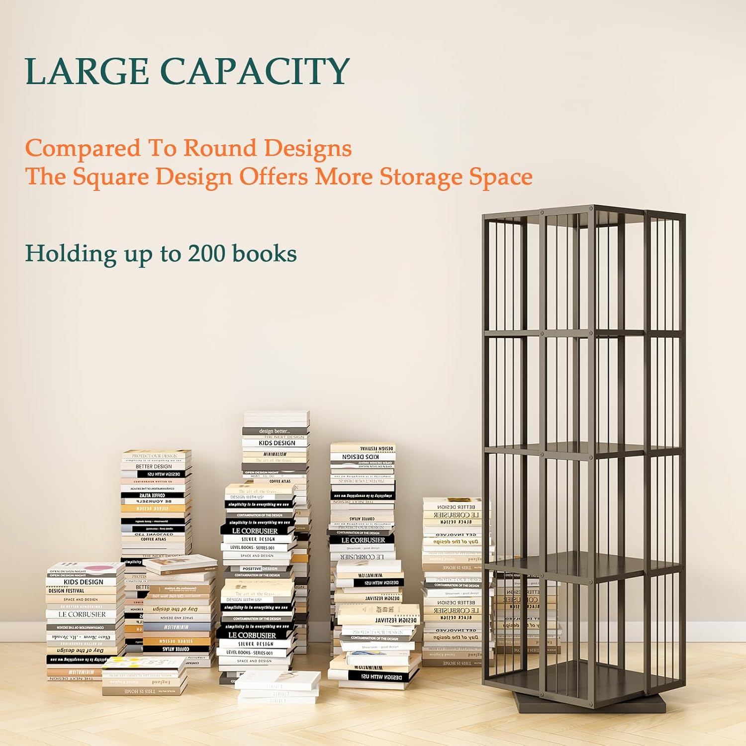 - COMPACT & SPACIOUS - Unlike common round designs, this square swivel bookcase maximizes space efficiency with greater capacity—holding at least 40 books per tier while occupying the same footprint. Its space-saving shape fits perfectly in corners and narrow spaces like apartments or dorms, making it ideal for compact living areas;