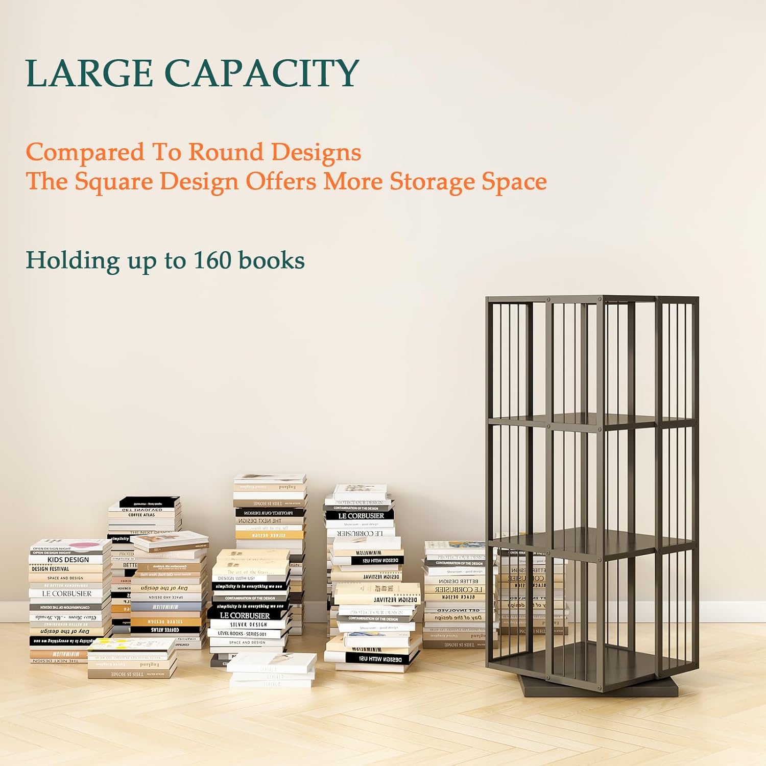 - COMPACT & SPACIOUS - Unlike common round designs, this square swivel bookcase maximizes space efficiency with greater capacity—holding at least 40 books per tier while occupying the same footprint. Its space-saving shape fits perfectly in corners and narrow spaces like apartments or dorms, making it ideal for compact living areas;
