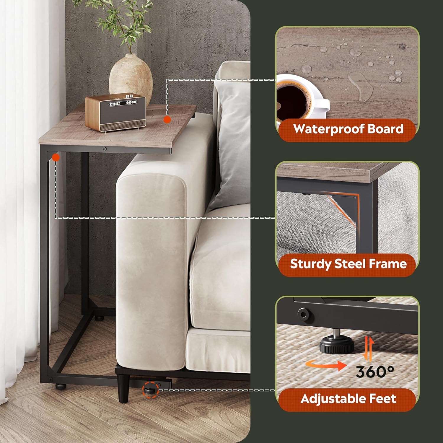 WLIVE C-Shaped End Table, Small Side Tables for Sofa, Wide Couch Table That Slide Under, Laptop Snack Table for Living Room, Bedroom, Home Office, Grey