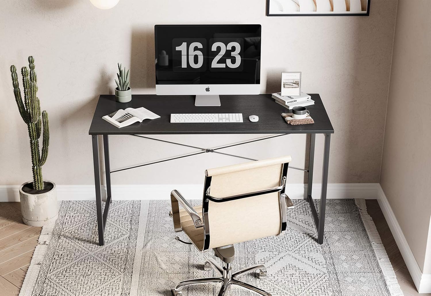 - Modern Simple Style: This computer desk suits all home decor styles. With its spacious desktop, you can easily fit your computer, laptop, coffee cups, mini plants, keyboards, etc.