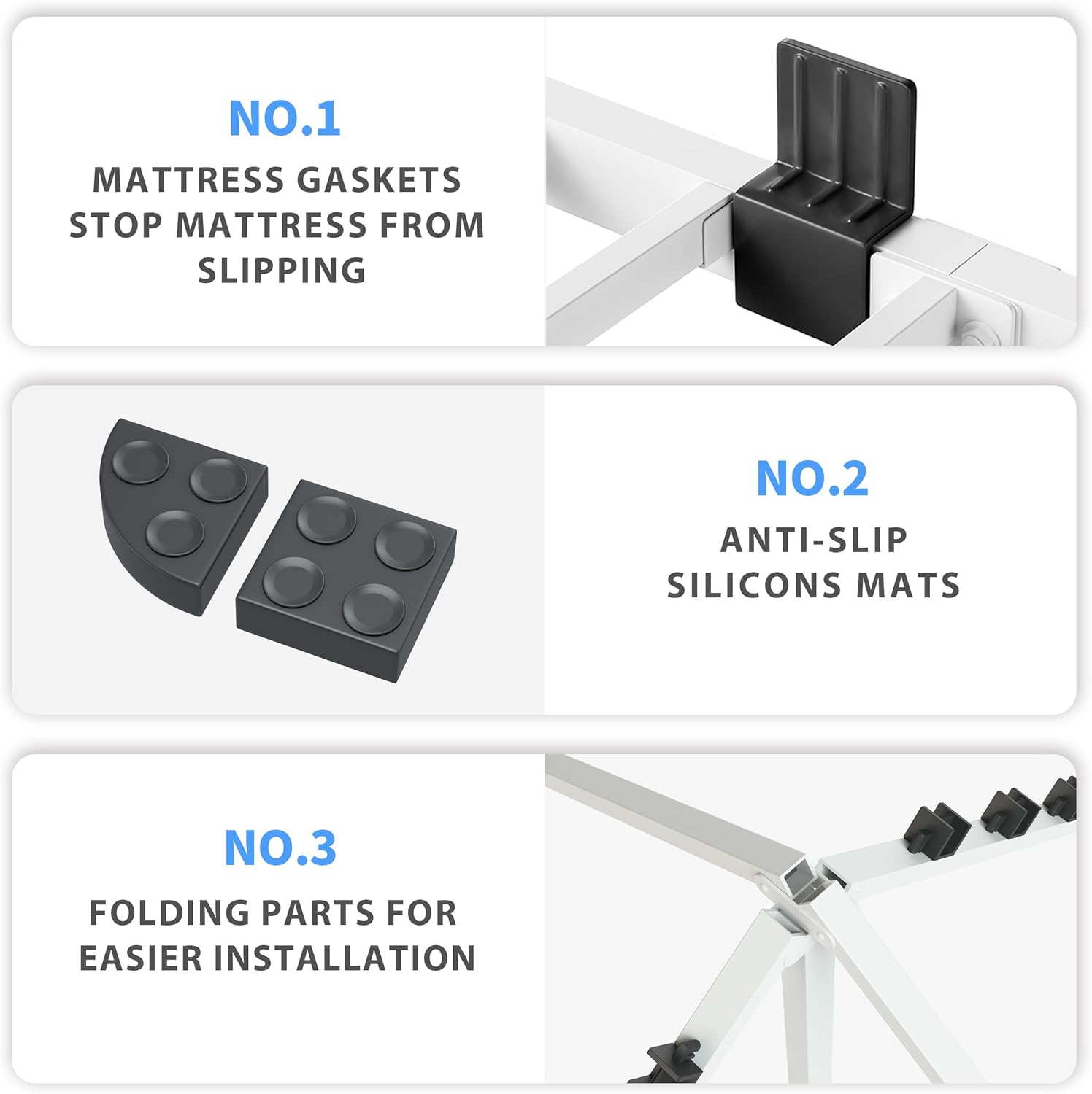 - 【NON-SLIP NOISELESS & ROUND CORNER DESIGN】Our bed frame has extra plastic non-slip plugs on all four sides to prevent the mattress from slipping off, and rubber feet with sound deadening effect to prevent the metal double bed frame from sliding and reduce noise at the same time. The bed frame is designed with safe rounded corners to avoid stubbed toes, whether it's a bedroom, guest room, dorm room or hotel, this bed frame is both stylish and practical.