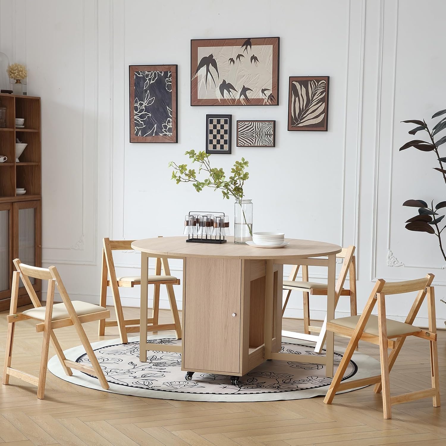 Wood Round Folding Dining Table with 4 Chairs, Solid Wood Folding Chair Set of 2, Space Saving Foldable Dining Table with 4 Chairs