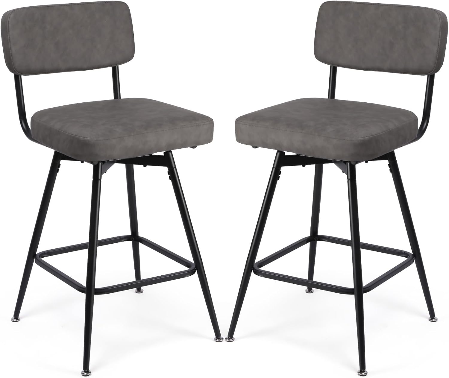 Swivel Counter Height Bar Stools Set of 2, Faux Leather Bar Stools with Back, Metal Legs and Footrest, 26" Seat Height Barstools for Kitchen Islands and Home Bars, Easy Assembly, Grey&Black