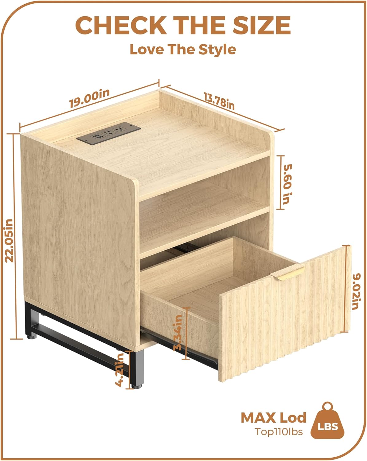 - SLEEK & MODERN DESIGN: Overall Size: 19.00"W x 13.78"D x 22.05"H. Featuring a smooth curved silhouette and stylish striped grooves, this nightstand adds a modern touch to any space. The natural wood grain tabletop pairs beautifully with gold drawer handles for a hint of luxury, while rounded corners offer both elegance and added safety perfect for homes with children