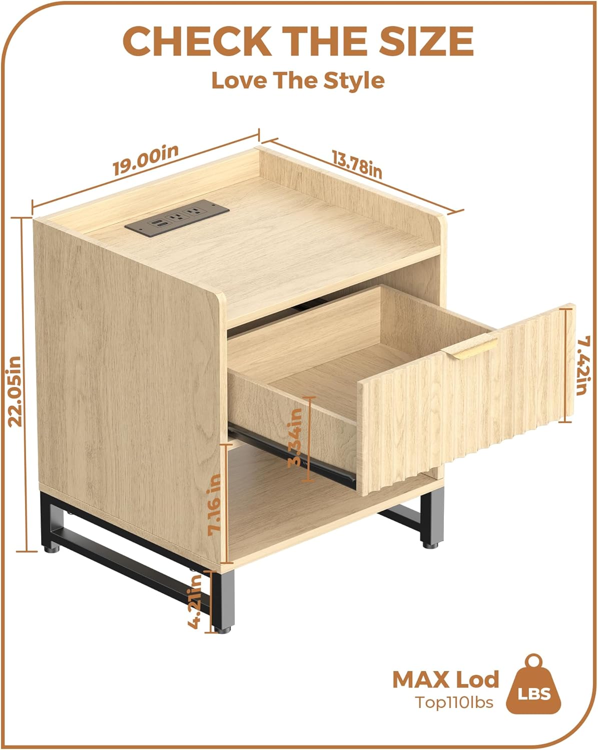 - SLEEK & MODERN DESIGN: Overall Size: 19.00"W x 13.78"D x 22.05"H. Featuring a smooth curved silhouette and stylish striped grooves, this nightstand adds a modern touch to any space. The natural wood grain tabletop pairs beautifully with gold drawer handles for a hint of luxury, while rounded corners offer both elegance and added safety perfect for homes with children