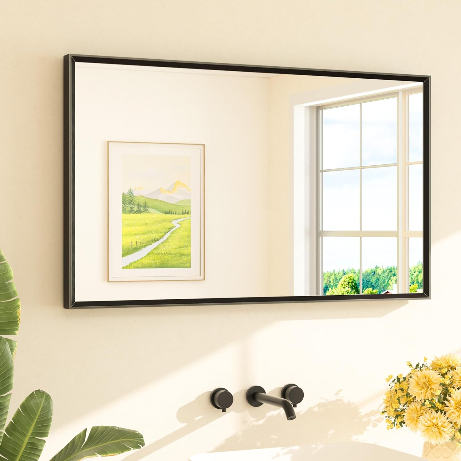 - 【Anodized Aluminum Frame Built to Last】 Crafted with a premium aluminum frame and finished with an anodized coating, our black metal trim mirror for wall offers exceptional durability and is waterproof, moisture-proof, and rust-proof—ideal for humid bathrooms. Its sleek, easy-to-clean surface also makes it a stylish and practical choice for bedrooms, living rooms, entryways, hallways, dressing rooms, and dining areas.