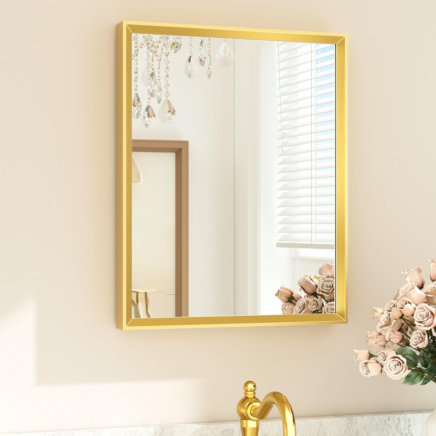 - 【Crystal-Clear Reflection with Tempered Glass】 This 16 x 20 inch brushed gold vanity mirror for bathroom is crafted with premium tempered glass for enhanced durability and impact resistance, built to withstand daily wear. Enjoy high-definition, crystal-clear reflections, while the built-in shatterproof film adds an extra layer of safety, making it a reliable and elegant choice for your bathroom.