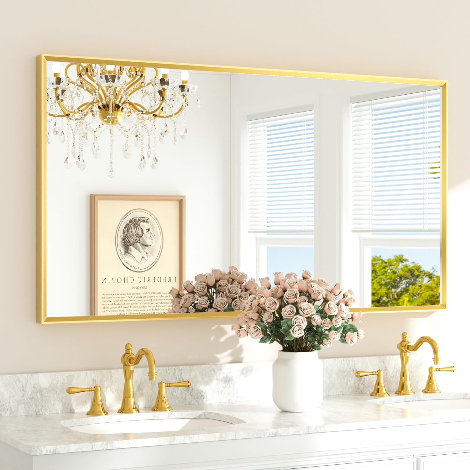 - 【Anodized Aluminum Frame Built to Last】 Crafted with a premium aluminum frame and finished with an anodized coating, our large gold bathroom mirror offers exceptional durability and is waterproof, moisture-proof, and rust-proof—ideal for humid bathrooms. Its sleek, easy-to-clean surface also makes it a stylish and practical choice for bedrooms, living rooms, entryways, hallways, dressing rooms, and dining areas.