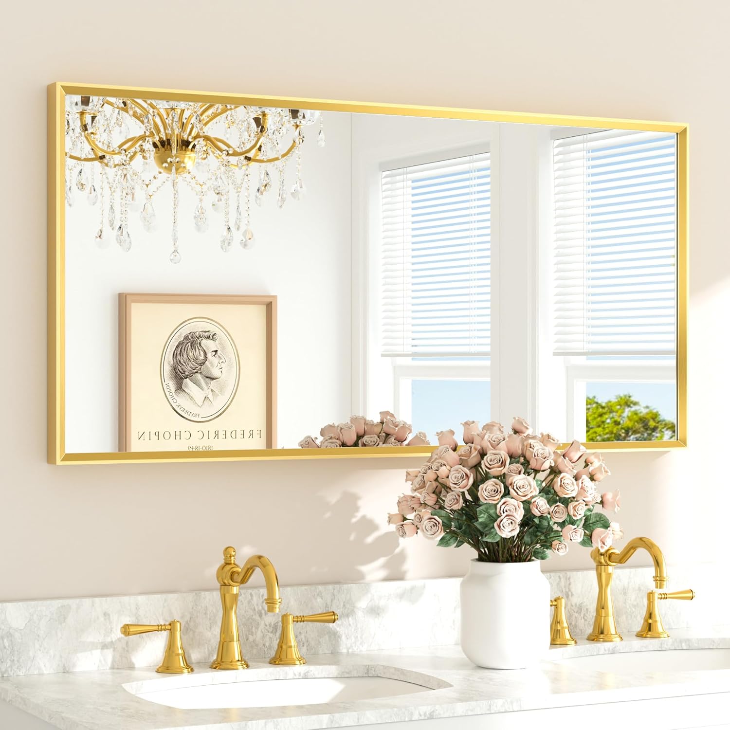 - 【Crystal-Clear Reflection with Tempered Glass】 This 48 x 24 inch brushed gold vanity mirror for bathroom is crafted with premium tempered glass for enhanced durability and impact resistance, built to withstand daily wear. Enjoy high-definition, crystal-clear reflections, while the built-in shatterproof film adds an extra layer of safety, making it a reliable and elegant choice for your bathroom.