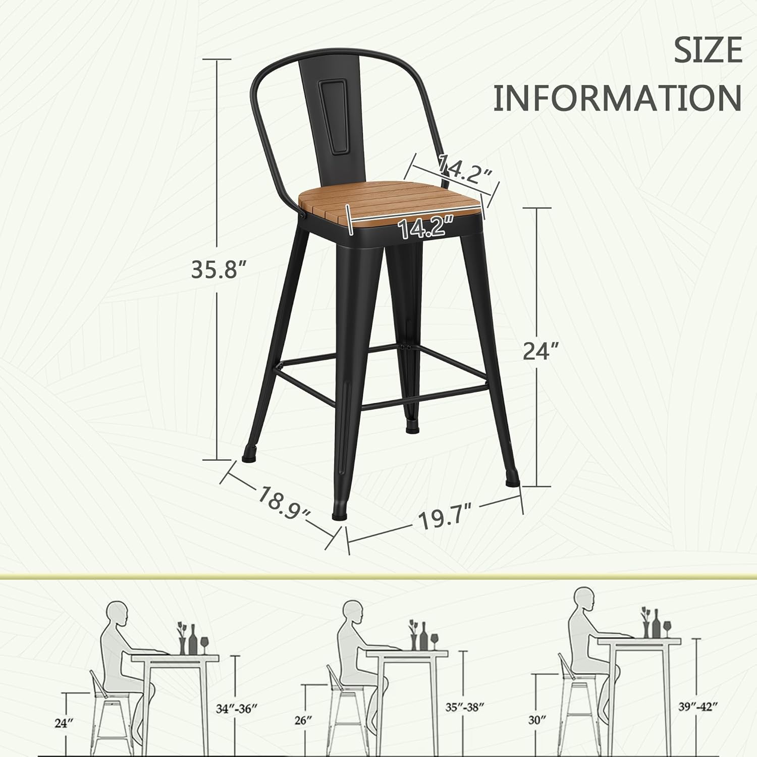 - 【Customer Service】 Bar stool set of 4. DIMENSIONS: 18.9"(L) x 19.7"(W) x 35.8"(H), Seat Area 14.2"* 14.2", Seat Height 24". All necessary hardware and instructions are included in the package. Please check the bar height chairs height before you make the order to match your space. If you have any problems, please let me know.