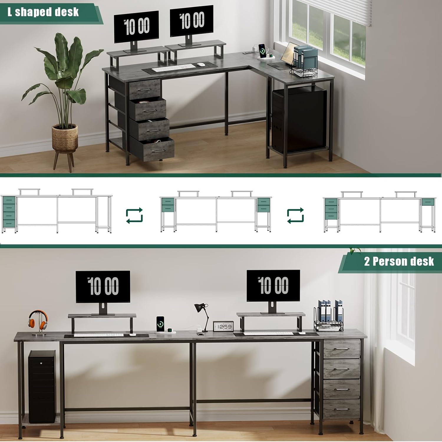 59 inch L Shaped Computer Desk with Power Outlets, Home Office Desk with 4 Adjustable Storage Drawers & 2 Monitor Stands, Two Person Gaming Table for Bedroom, Grey