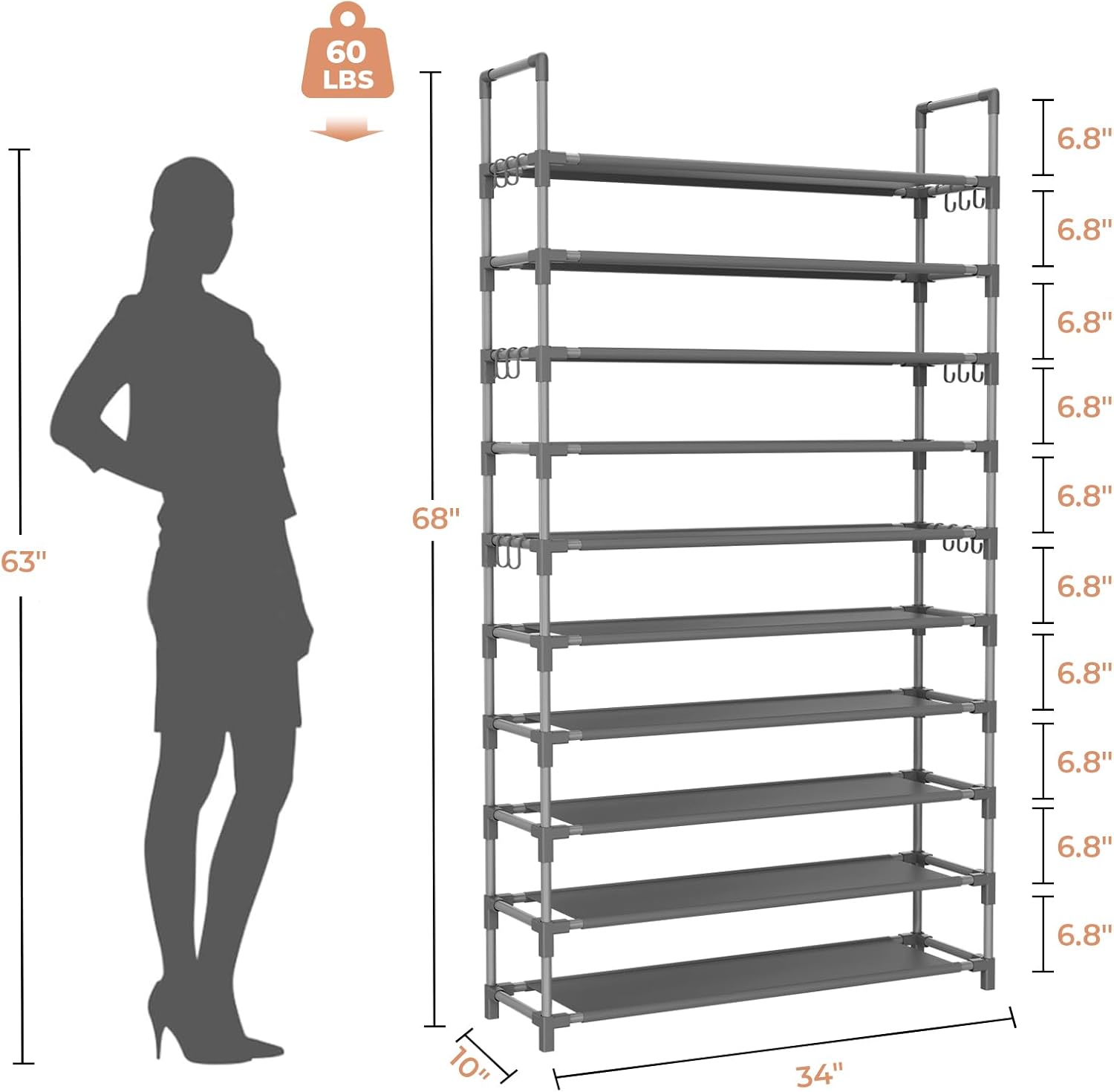 - Space Saving Shoe Rack: Size of shoe storage: 34"W x 10"D x 68"H, the floor space is only 0.22m³, free standing shoe racks takes advantage of vertical space, giving an open feel to the space. The large shoe rack perfect for closet, front door entrance, dorm, hallway