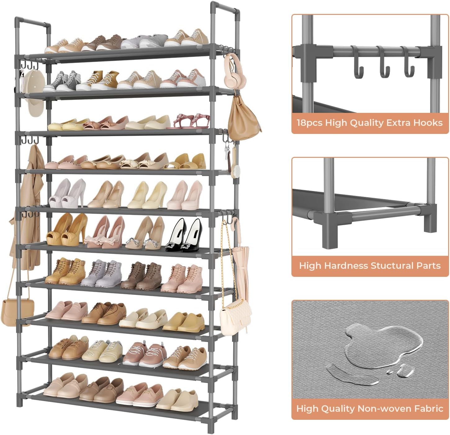 Tall Shoe Rack 10 Tier Shoe Organizer Large Shoe Shelf with 18 Hooks Storage for 50 Pair Sneaker and Boot, Stackable Vertical Shoe Rack Organizer for Closet, Entryway, Bedroom, Grey