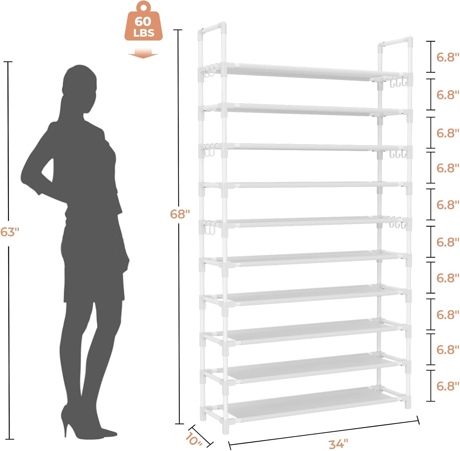 - Large Capacity Shoe Rack: This 10 tier shoe rack tall, can storage for 50 pairs shoes and boots, with enough storage space. This shoe rack for closet height of each tier is 6.7", perfect for sandals, slipper, sneakers, boot, heels all types of shoes