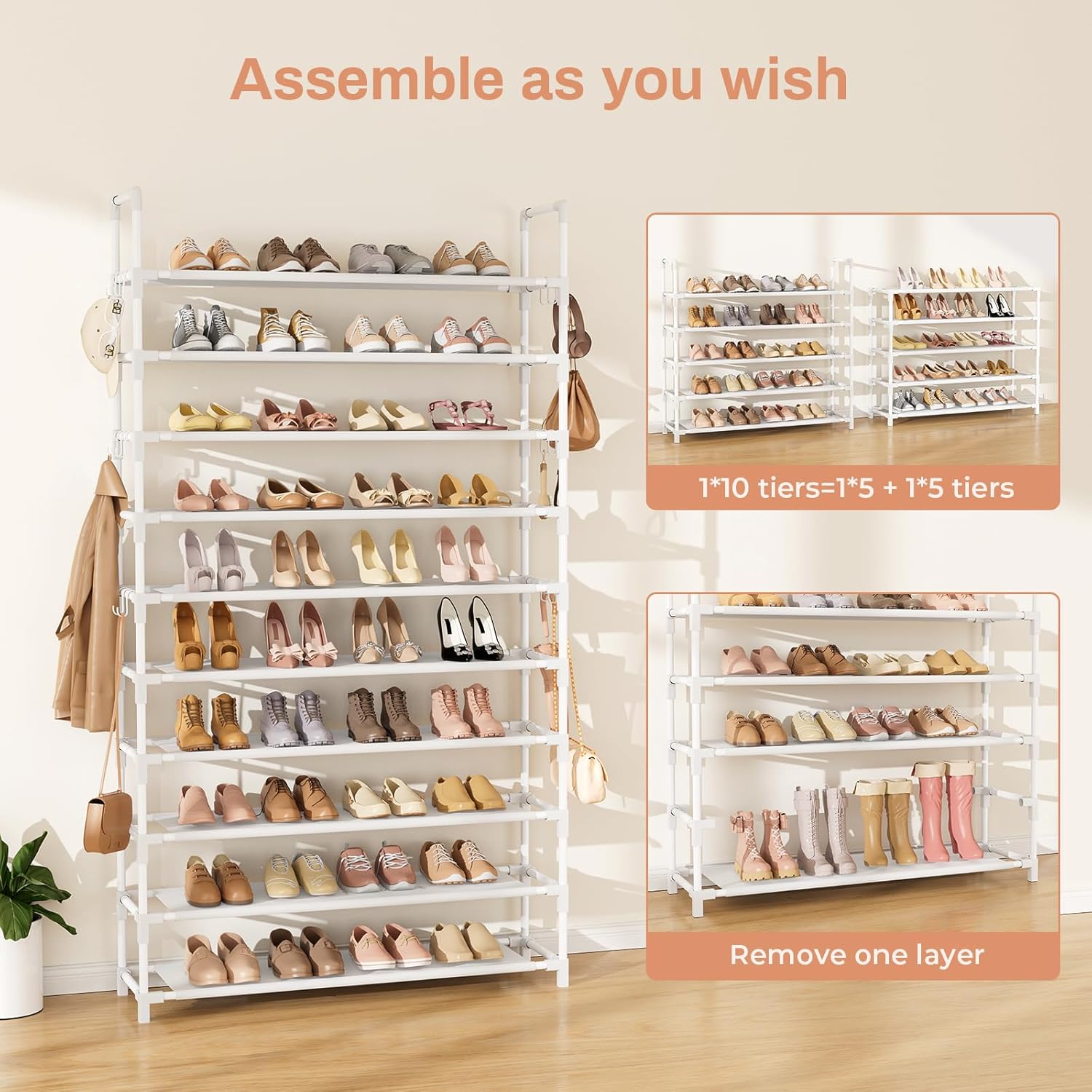 Tall Shoe Rack 10 Tier Shoe Organizer Large Shoe Shelf with 18 Hooks Storage for 50 Pair Sneaker and Boot, Stackable Vertical Shoe Rack Organizer for Closet, Entryway, Bedroom, White