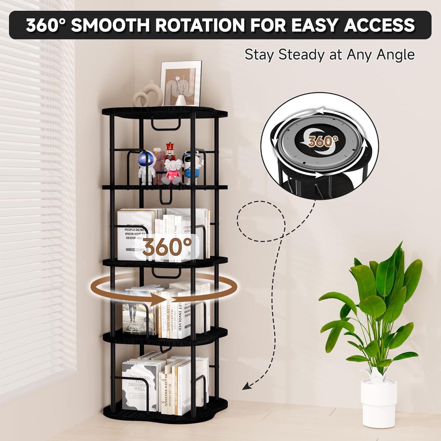 - 【360° Rotating Bookshelf】The 360° rotating bookshelf features a rotating base that allows smooth, silent rotation, making it easy to access books from any side. Whether you place your books on the front, back, or sides, a gentle turn brings them within reach. It operates quietly, ensuring no disturbing noise while in motion. The bookshelf is designed for stability and will not wobble easily. The petal-shaped wooden boards add an elegant touch to the overall design, while also preventing collisions, ensuring both beauty and safety.