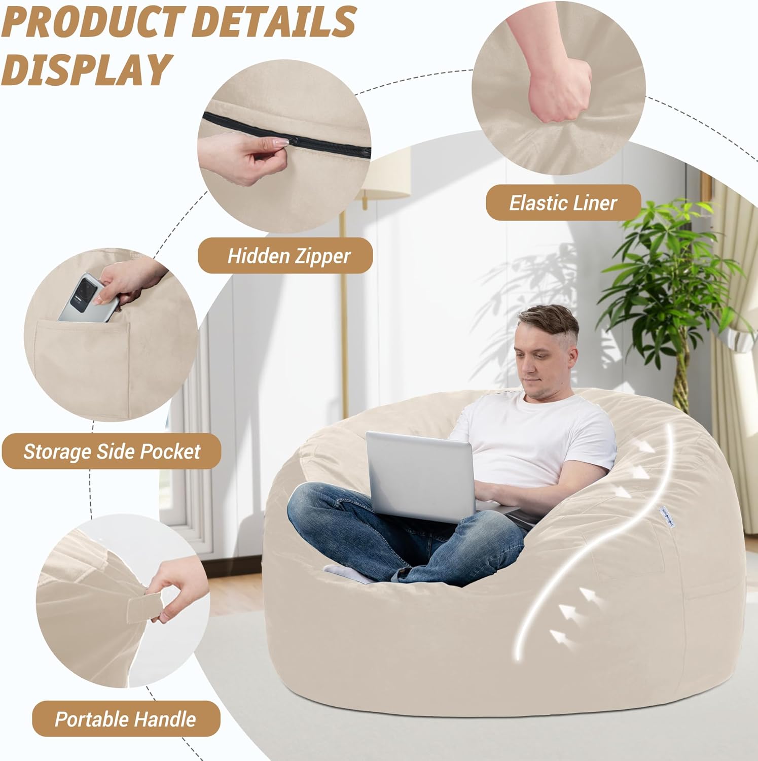 - 🎀【Thoughtful Details Design】Large beanbag chair features intimate pockets, a movable handle and double zippers. Our side pockets are deep enough to hold phones, books, remote controls, and more. The portable handle allows you to move anywhere in the house and enjoy your time. And the upgraded double-ended zipper can be fully opened, while the hidden design does not affect the beauty.