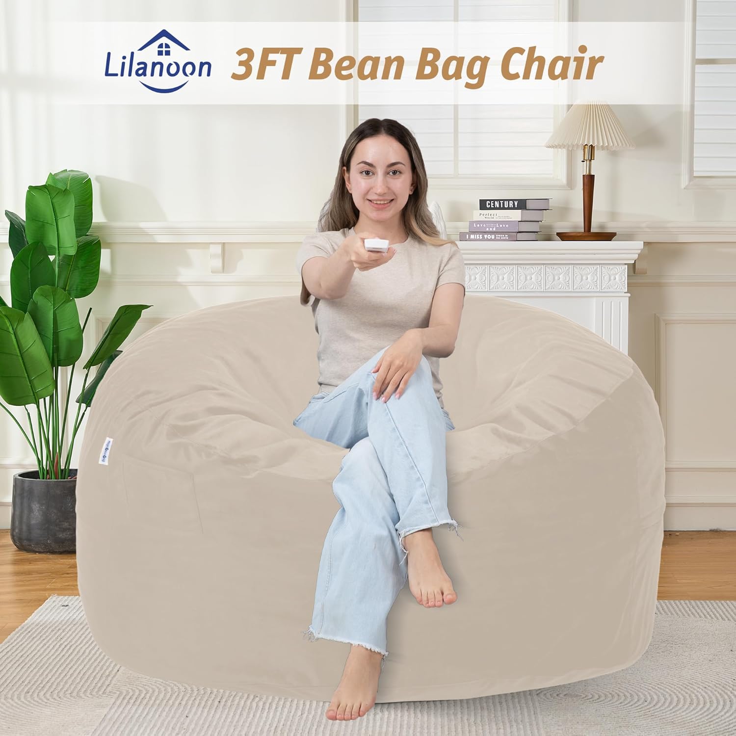 3FT Bean Bag Chair with Ultra Soft Velvet Cover Bean Bag Sofa with Memory Foam Bean Bag Chairs with Large Size Lazy Sofa for Dorm Office Living Room Bedroom Beige 3'