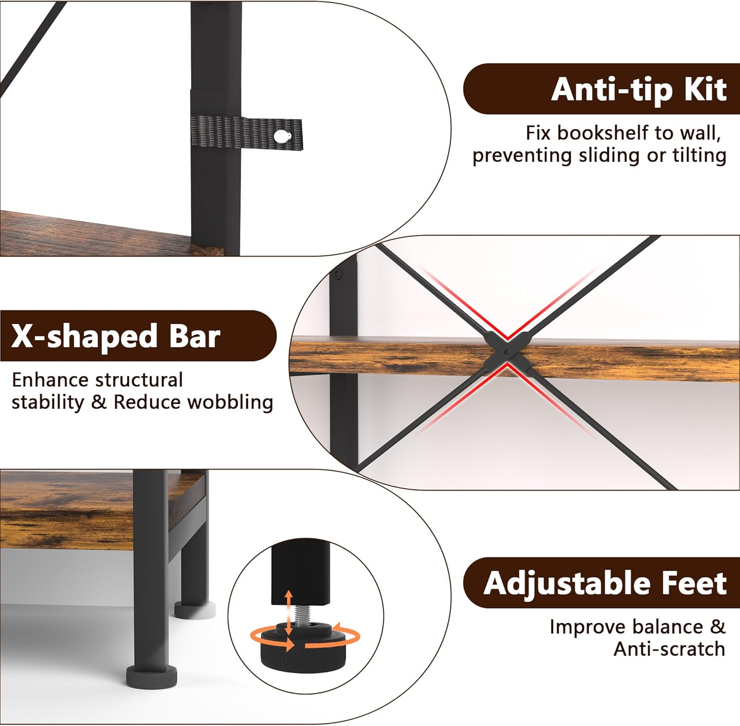 - 【X-shaped Bars & Adjustable Feet】This tall bookshelf features an X-shaped steel back frame that enhances both aesthetics and item security. The adjustable feet at the base easily adapt to uneven floors, reducing wobbling during use. Importantly, the anti-scratch foot effectively protect your floors from damage while improving stability. Safe to use on hardwood and tile.
