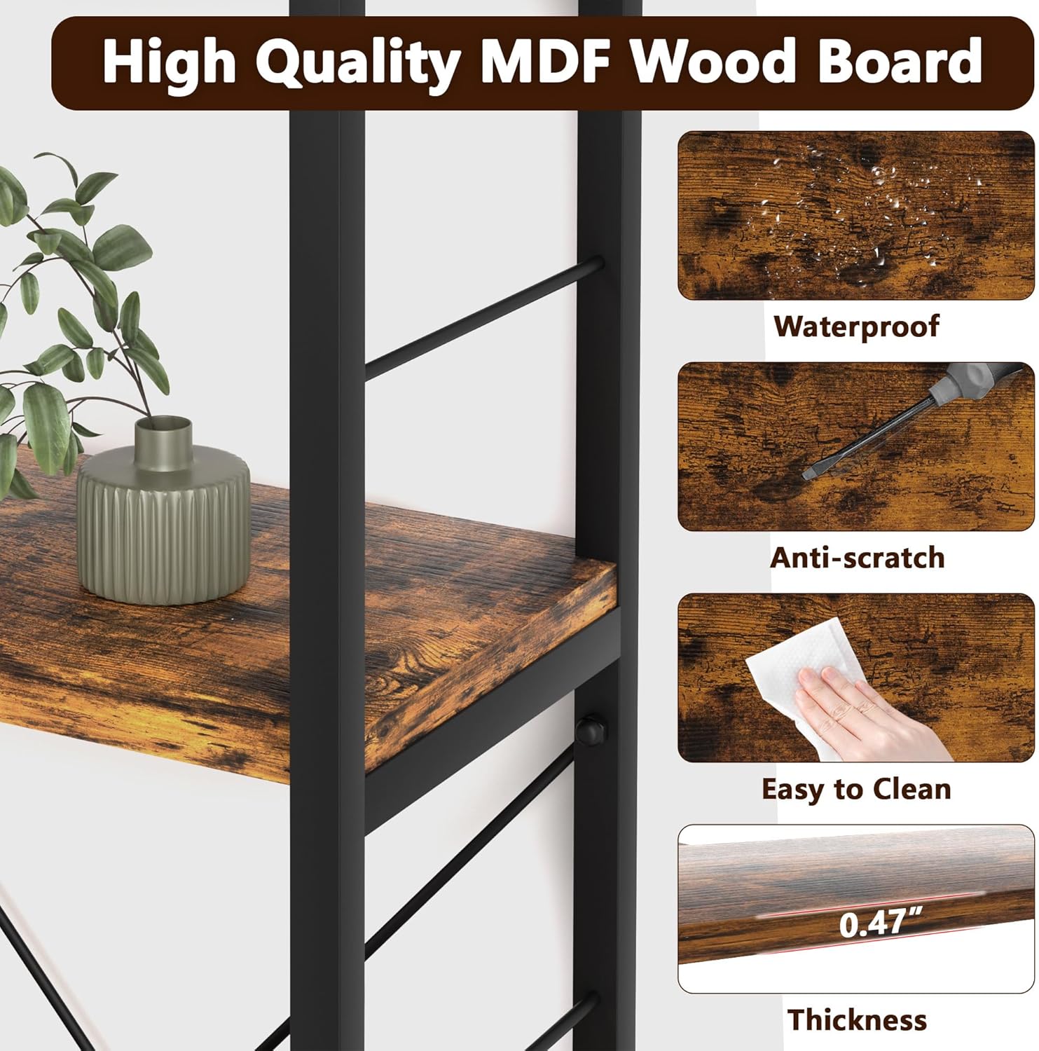 - 【High-quality MDF Wood & Steel Frame Construction】This corner shelf features thick MDF wood boards paired with a high-quality metal steel frame, combining to provide exceptional stability. The specially treated wood panels are waterproof and anti-scratch, ensuring long-lasting durability. With each shelf supporting up to 30lbs, it safely holds books, collectibles, and valuables with confidence. The rugged steel frame prevents warping over time, while the refined wood grain surface maintains a natural aesthetic that blends seamlessly into any decor.