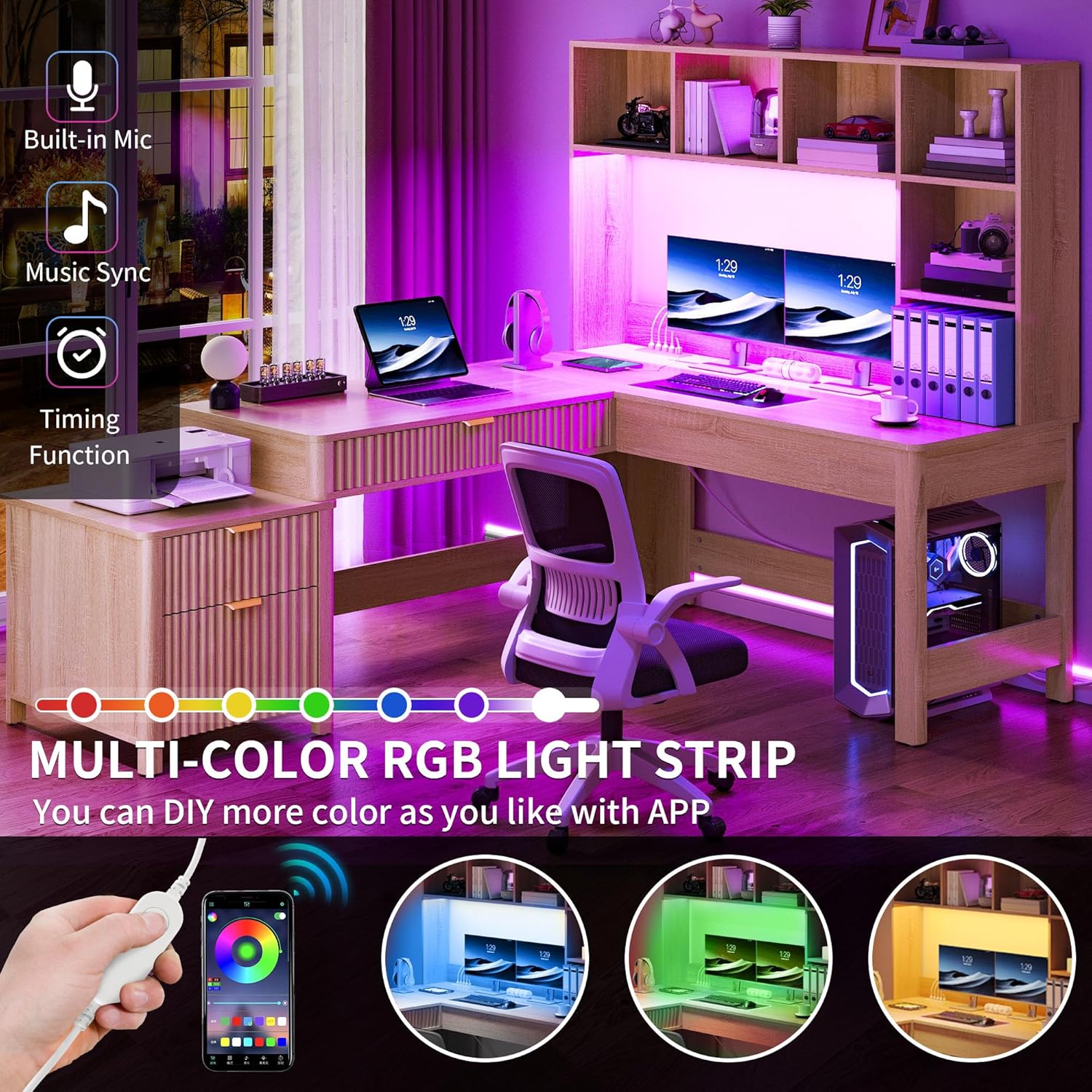 - Smart LED Light Strips: Our gaming desk with drawers features a beautiful RGB LED light strip, flexibly controlled by a phone app or light strip switch, and you can customize any color you like via app. Plus, choose from various modes including music sync,built-in Mic and timers functions to enhance your productivity or gaming ambiance while working or gaming