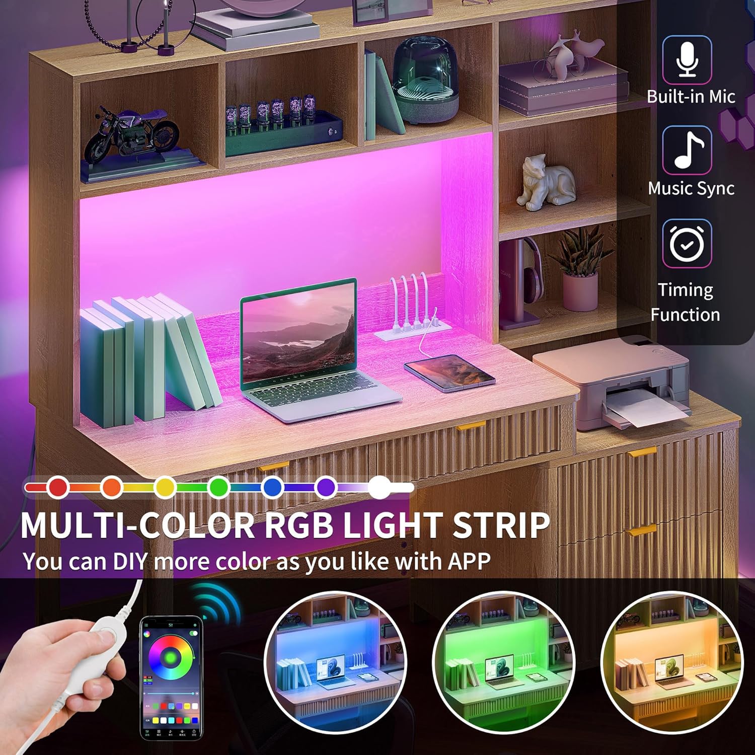 YITAHOME Computer Desk with Hutch and Drawers, 55" Office Desk with Storage Shelves and Printer Stand, Gaming Desk with Power Outlets & LED Lights, Fluted Sturdy Writing Workstation, Natural Oak