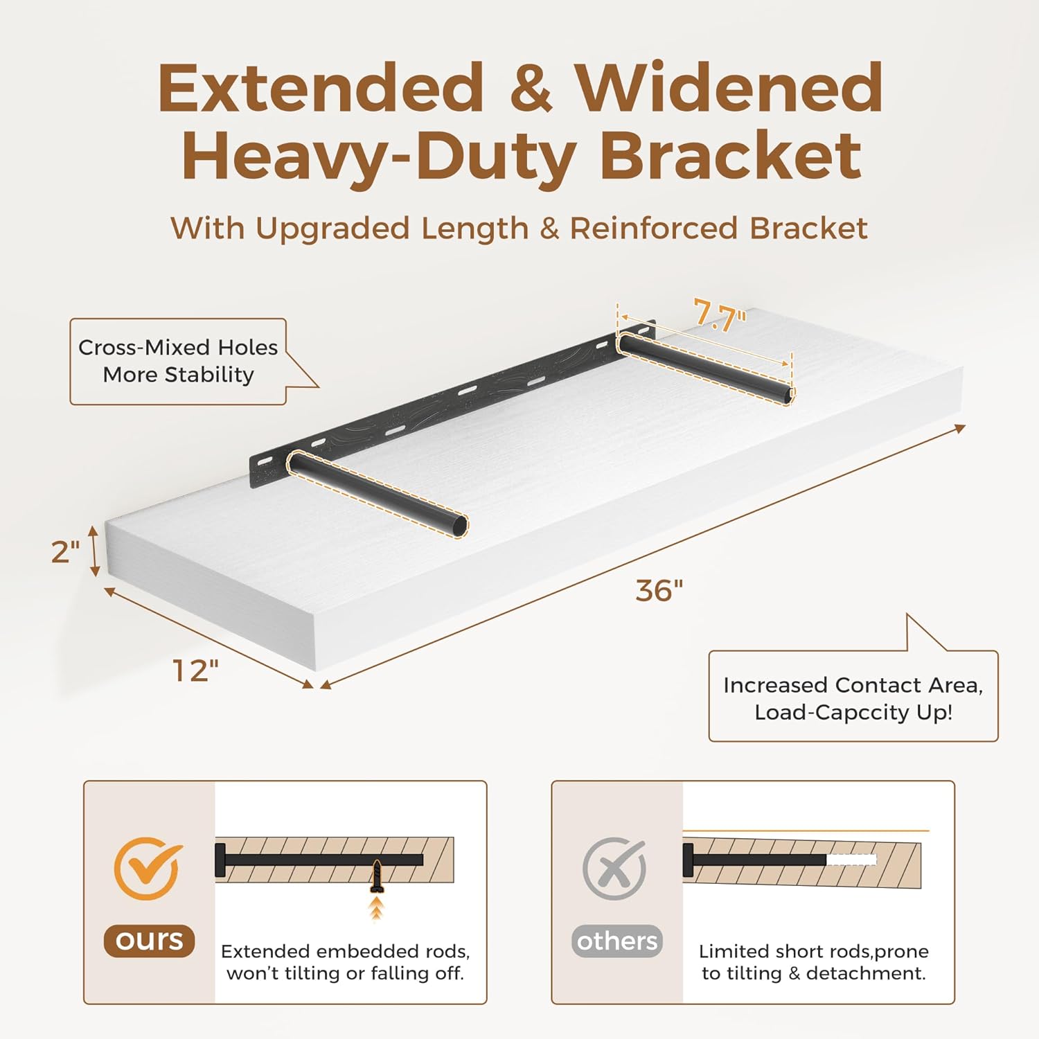 White Floating Shelves 36 Inch Long, 12 Inch Deep Floating Shelves for Wall, 36 x 12 Shelves for Wall Storage & Display, 2" Thick Floating Shelf for Bathroom, Living Room, Bedroom, Set of 2