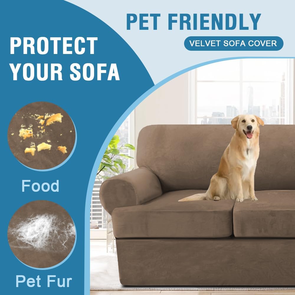 H.VERSAILTEX Sofa Cover 3 Piece T Cushion Sofa Slipcovers Thick Velvet Couch Cover Stretch T Cushion Sofa Covers for 2 Cushion Couch with 2 Individual T Cushion Covers, Mocha
