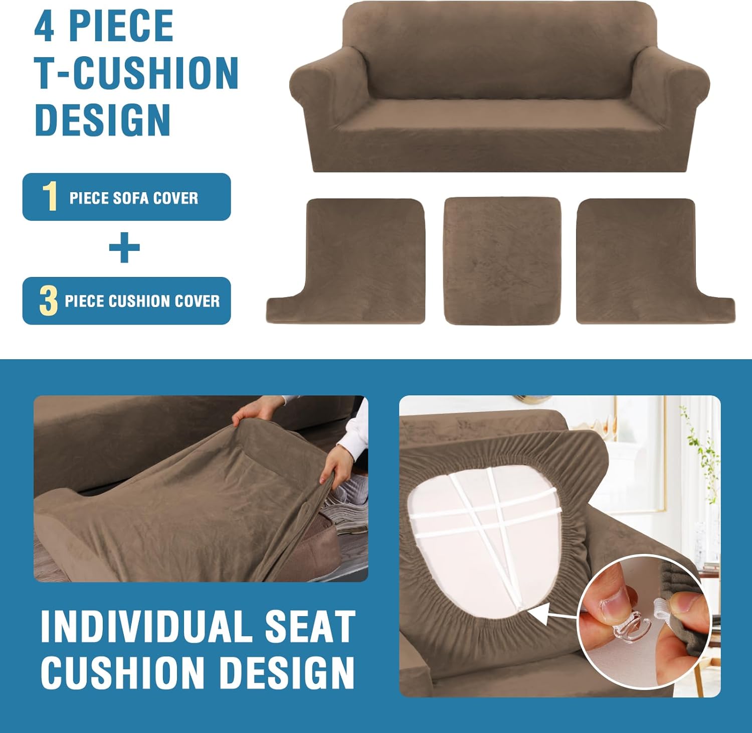 H.VERSAILTEX Sofa Cover 4 Piece T Cushion Sofa Slipcovers Thick Velvet Couch Cover Stretch T Cushion Sofa Covers for 3 Cushion Couch with 3 Individual T Cushion Covers, Mocha