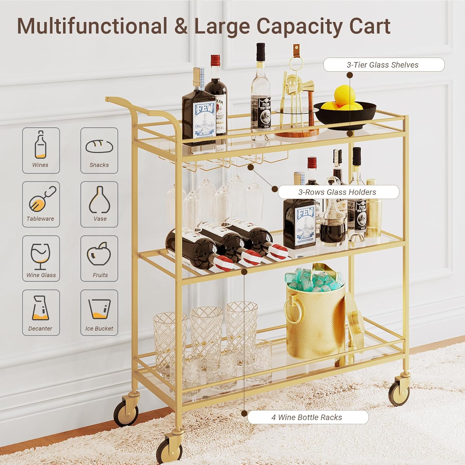 - [Versatile Bar Cart]: With 4 swivel wheels and curved handles, this serving cart is easy to move around. You can also lock two of the wheels in place to securely position the cart when needed. Besides being a bar cart, it can also serve as a kitchen cart, coffee cart, or beverage cart. Perfect for your bar area, restaurant, kitchen, or living room!