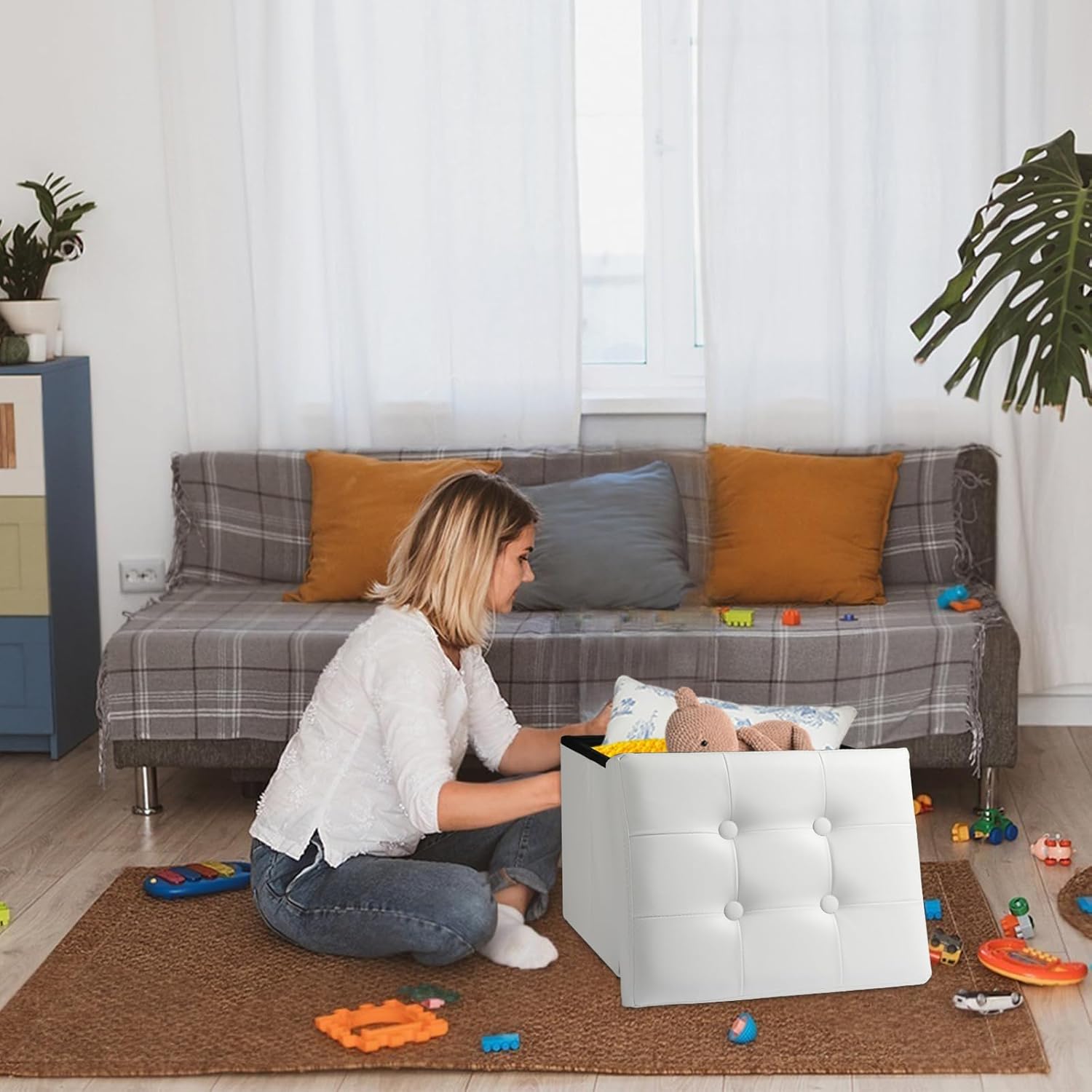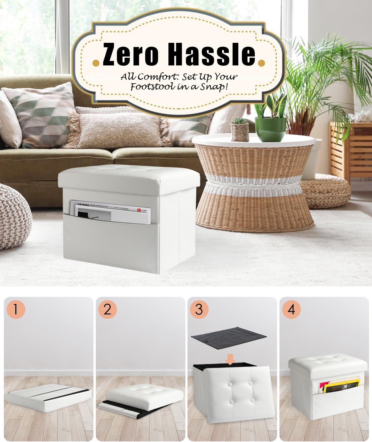- Easy to install and fold:The storage bench for bedroom features a unique folding design that allows for quick setup and folding. To use, simply unfold the ottoman, insert the base plate, and you're ready to go. When not in use, it can be easily folded and stored in the closet or under the bed to save space